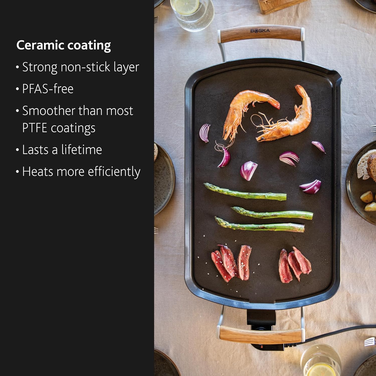 Boska Electric Griddle Pro – PFAS-Free Ceramic Nonstick Surface – Adjustable Heat up to 420°F – Grease Drain Spout – Oak Wood Handles – Black