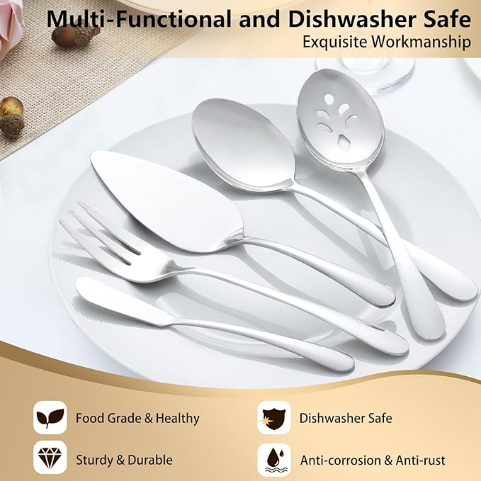 • 【65-Pieces Flatware Set For 12】Our 65 pieces silverware set contains 12 dinner spoons, 12 teaspoons, 12 dinner forks, 12 salad forks, 12 dinner knives. In addition to this, it also comes with 1 serving fork, 1 butter knife, 1 pie server, 1 serving spoon and 1 serving slotted spoon. Ideal for home use or for important occasions.