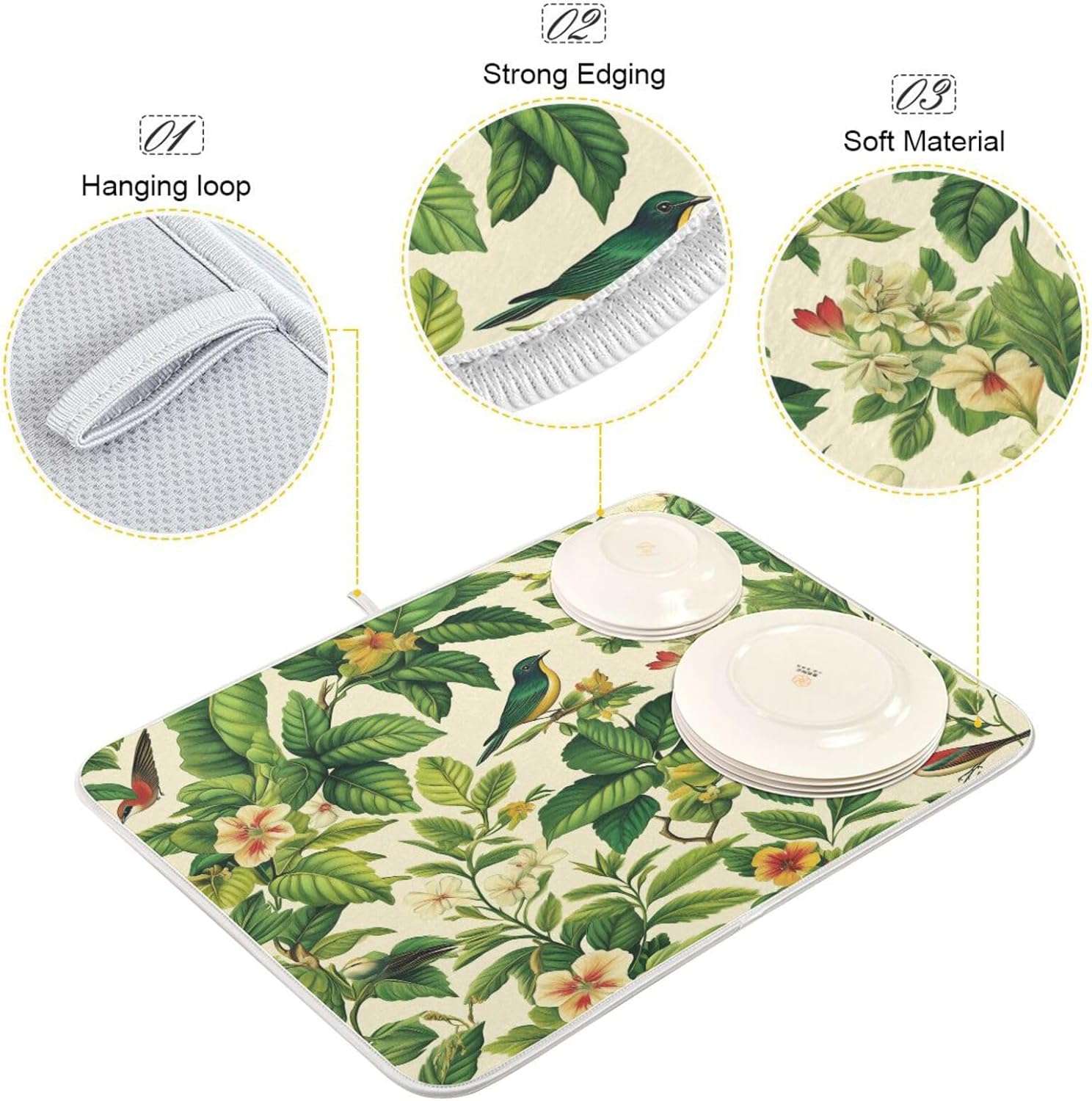 Green Leaf Bird Flower Dish Drying Mat for Kitchen Counter Super Absorbent Dishes Pad Reversible Microfiber Protector Dish Draining Mats 18x24 inch