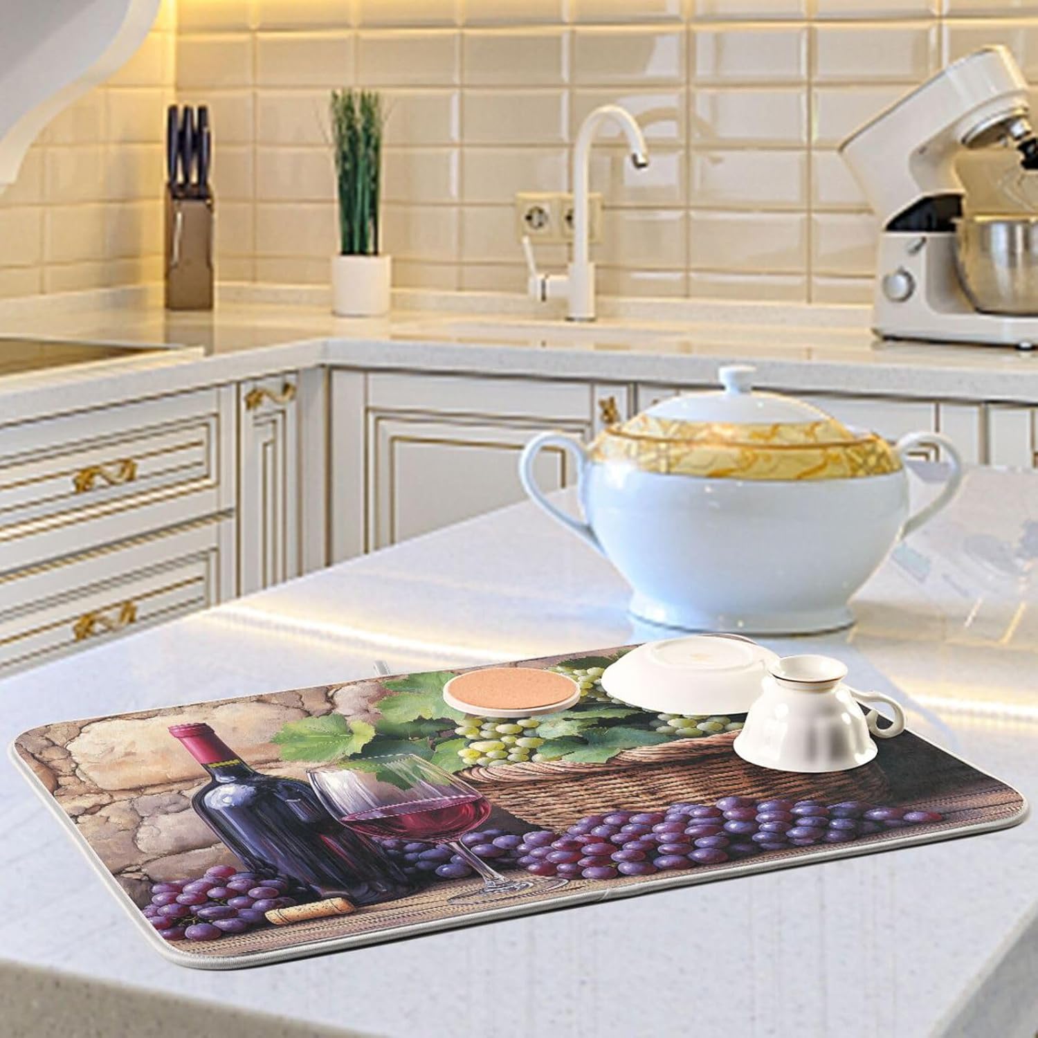 Wine Bottle Wine Glass Grapes Dish Drying Mat for Kitchen Counter Super Absorbent Dishes Pad Reversible Microfiber Protector Dish Draining Mats 16x18 inch