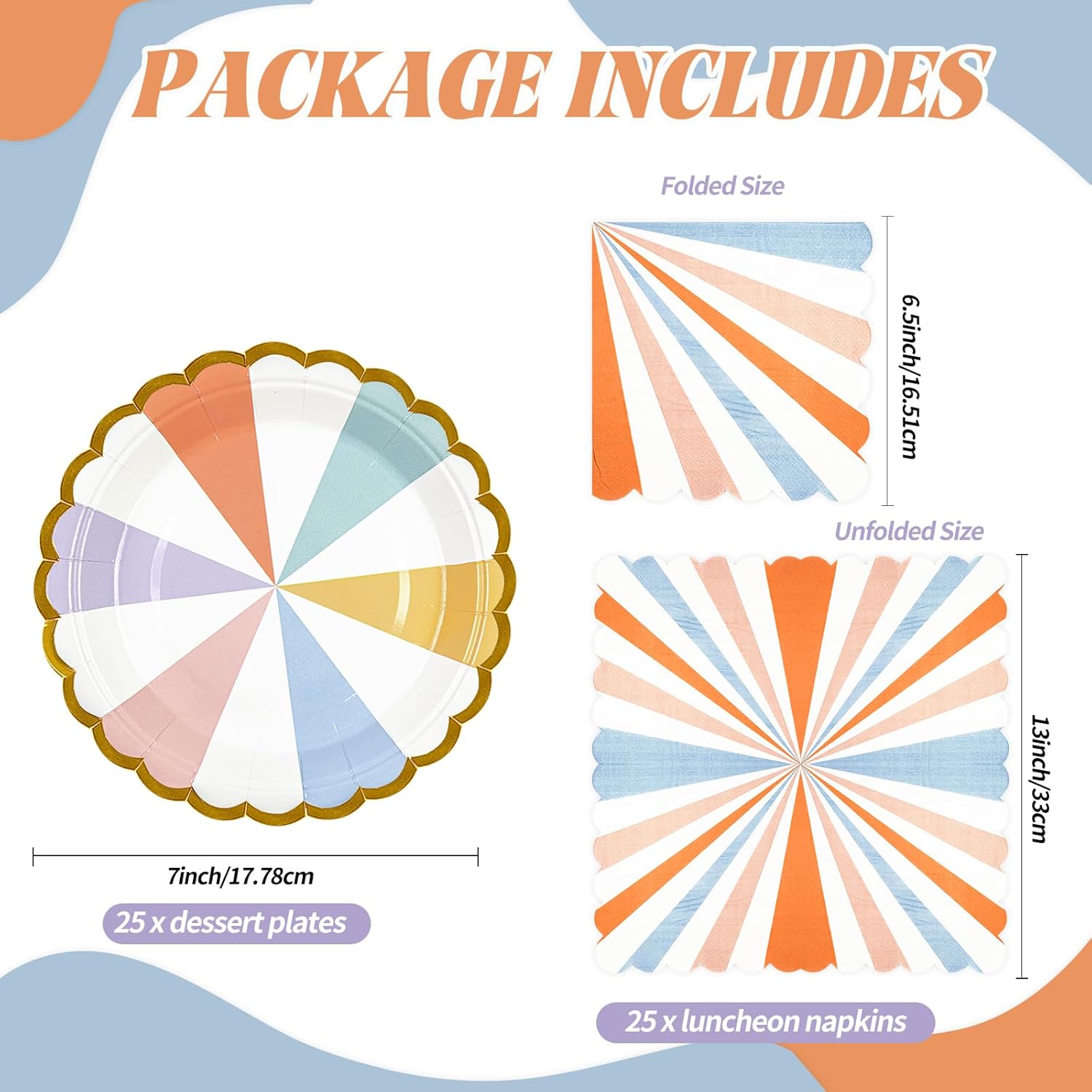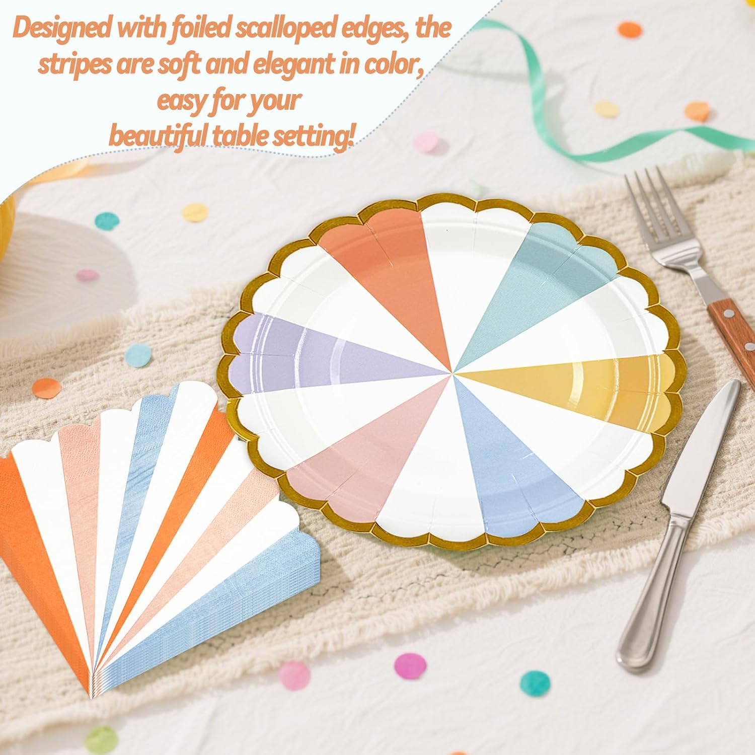 50PCS Colorful Striped Paper Plates and Napkins Party Supplies, 7 inch Disposable Gold Foil Scalloped Dessert Plate Pastel Party's Favors for Birthday Wedding Bachelorette Candy Party Decorations
