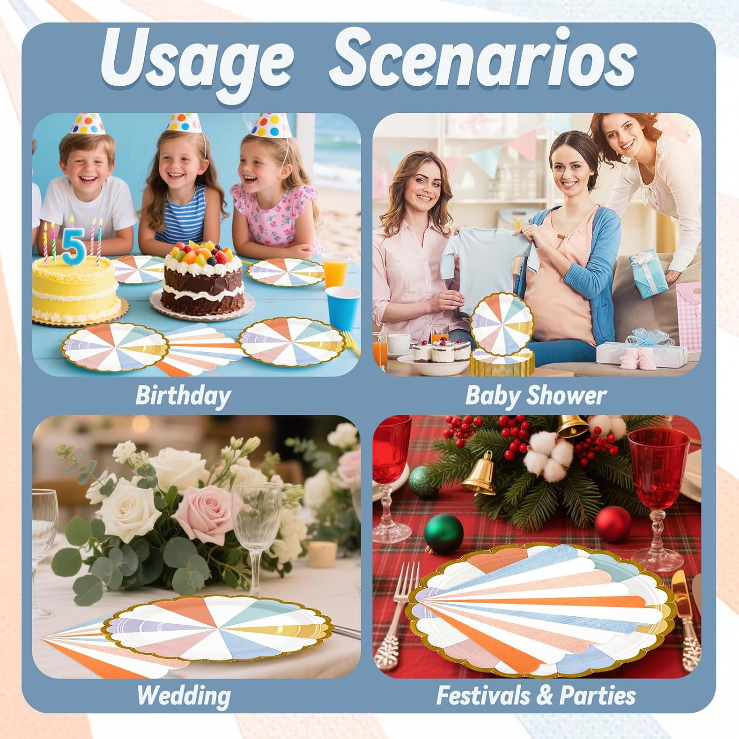 • 【ELEGANT DESIGN】: The fashionable gold foil scallop edges, candy-like rainbow stripe design, soft colors and elegant paper plates can easily decorate your perfect dining table, leaving a deep impression on you and your guests and celebrating wonderful times together.