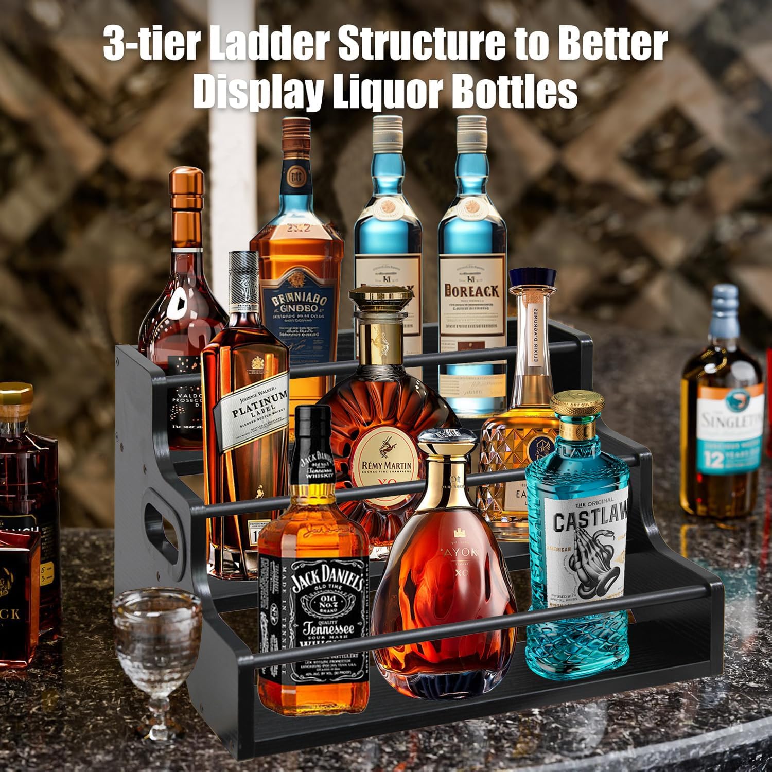 AT-VALY 3-Tier Countertop Wine Rack, Iron&MDF Kitchen Storage Shelf, Space-Saving Countertop Organizer for Spices, Herbs, Seasonings, Sturdy Stylish Condiment Holder(Black Grain)