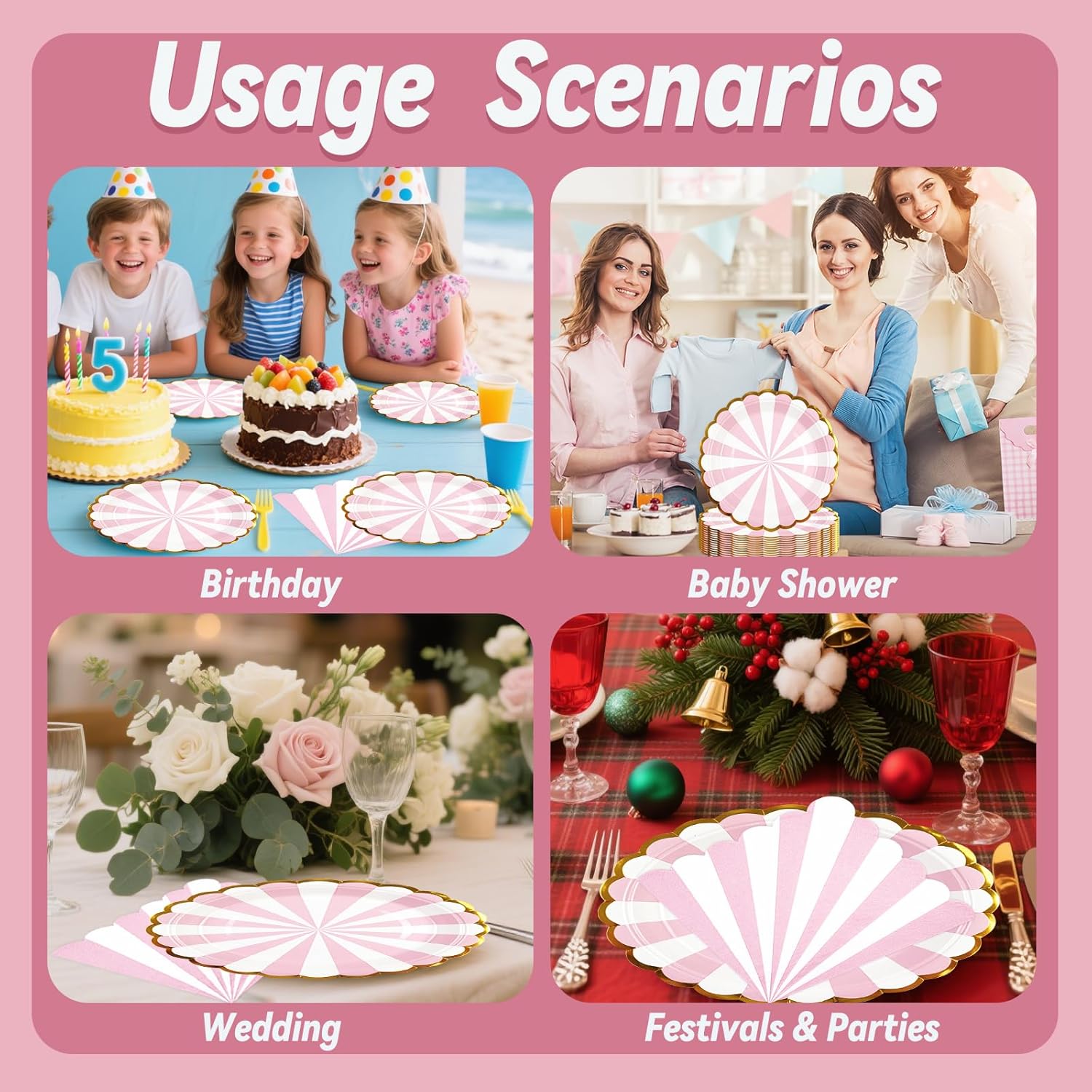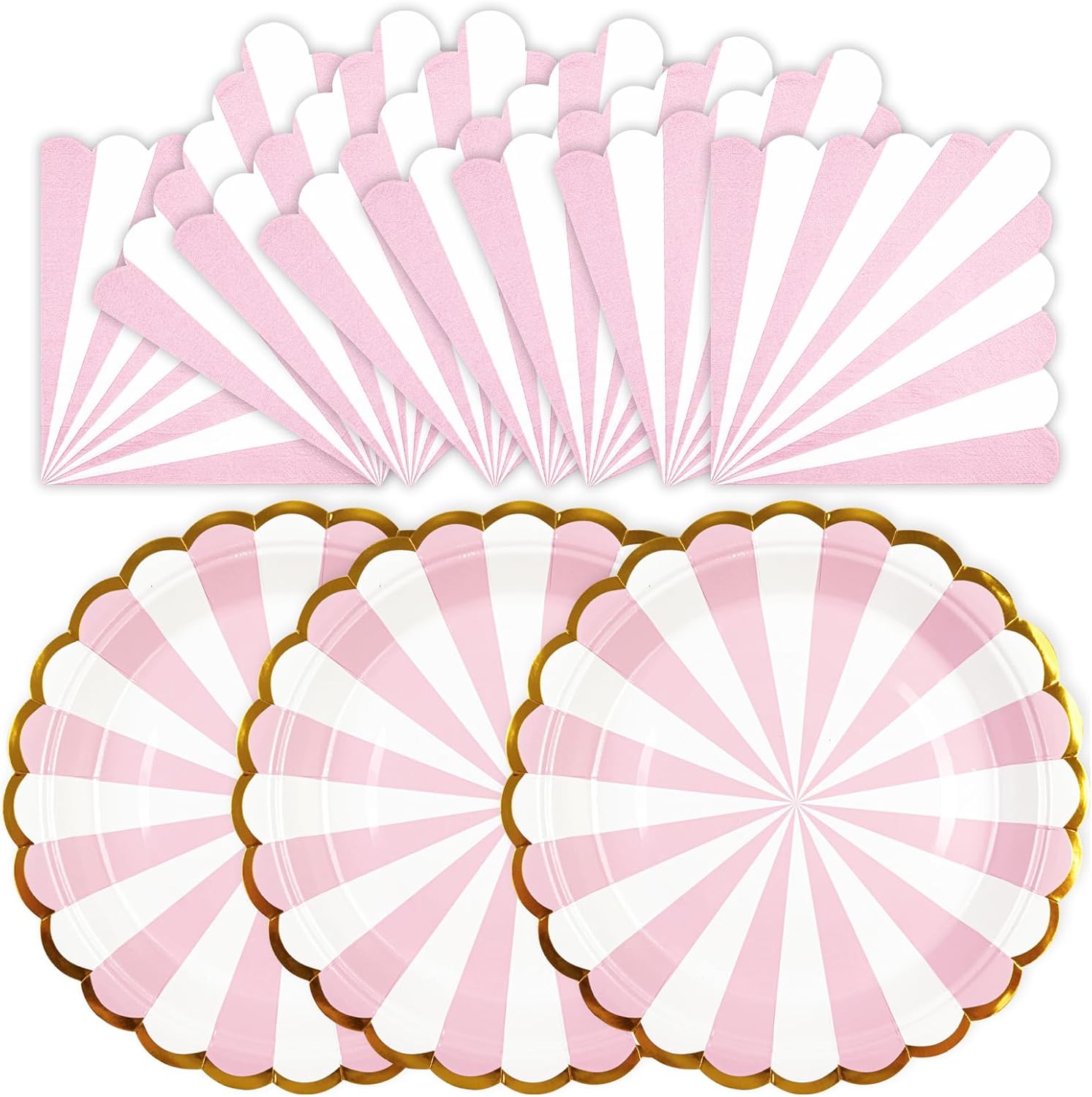 50PCS Pink Striped Paper Plates and Napkins Party Supplies, 7 inch Disposable Gold Foil Scalloped Dessert Plate Party Dinnerware Set for Birthday Wedding Bachelorette Baby/ Bridal Shower Decorations