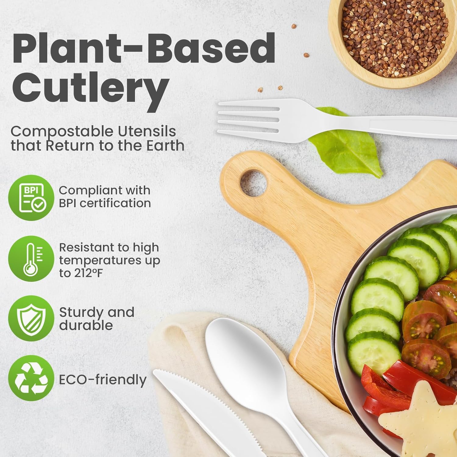 • ECO-FRIENDLY AND HEAVY-DUTY — BETTER THAN PLASTIC FORKS OR BAMBOO FORKS: Our Cornstarch Cutlery Set is thoughtfully designed to deliver an exceptional experience. Unlike flimsy bamboo utensils that break easily or plastic cutlery that pollutes the environment, our cornstarch cutlery offers a durable, eco-friendly alternative that doesn’t compromise on strength, quality, or sustainability.