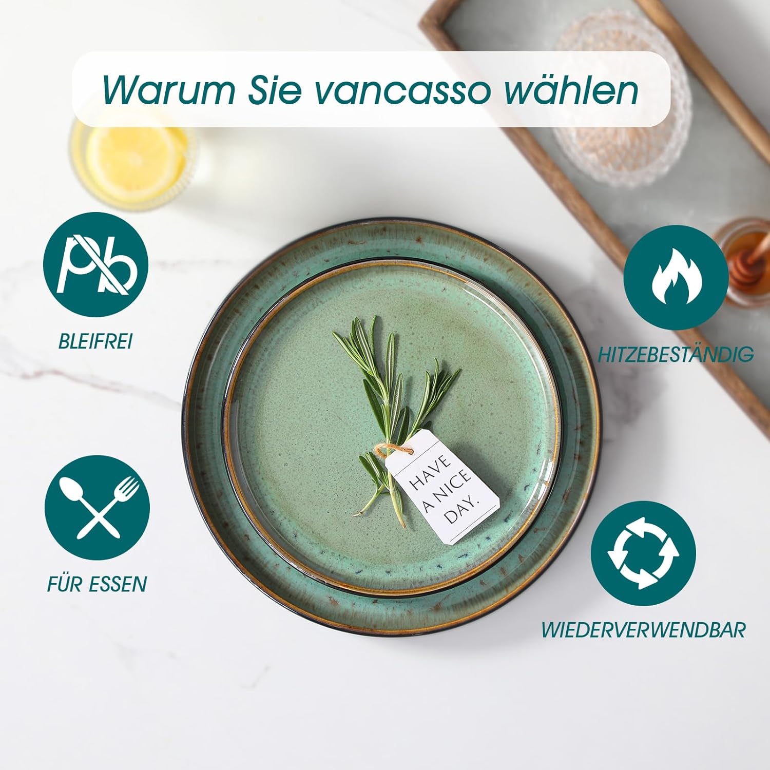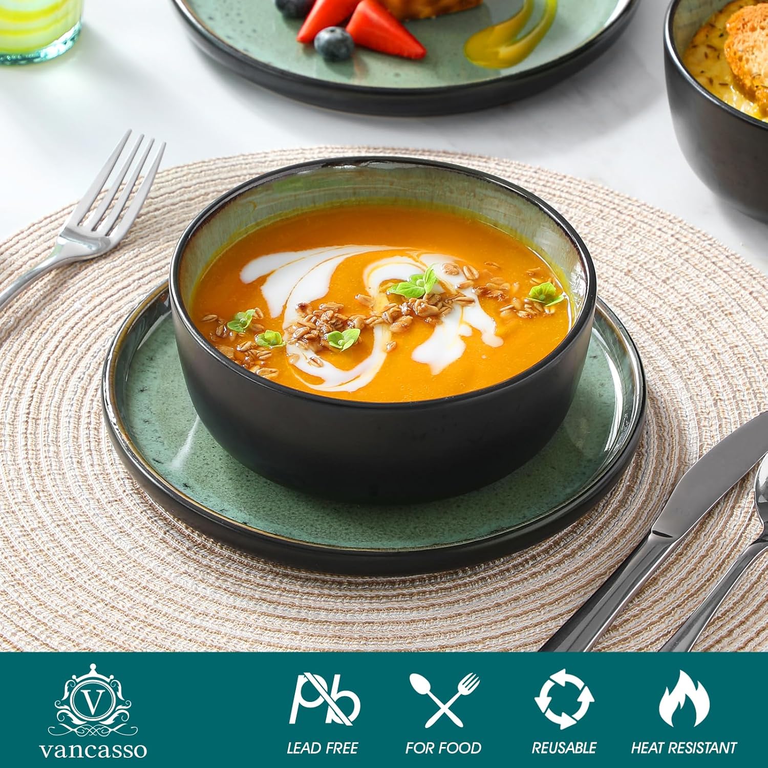 vancasso Plates and Bowls Sets, 18 Pieces Stoneware Dinnerware Sets for 6, Kitchen Dish Set Mircowave and Dishwasher Safe Dinner Set Ceramic Dishware, Turf Green, Series AMBER