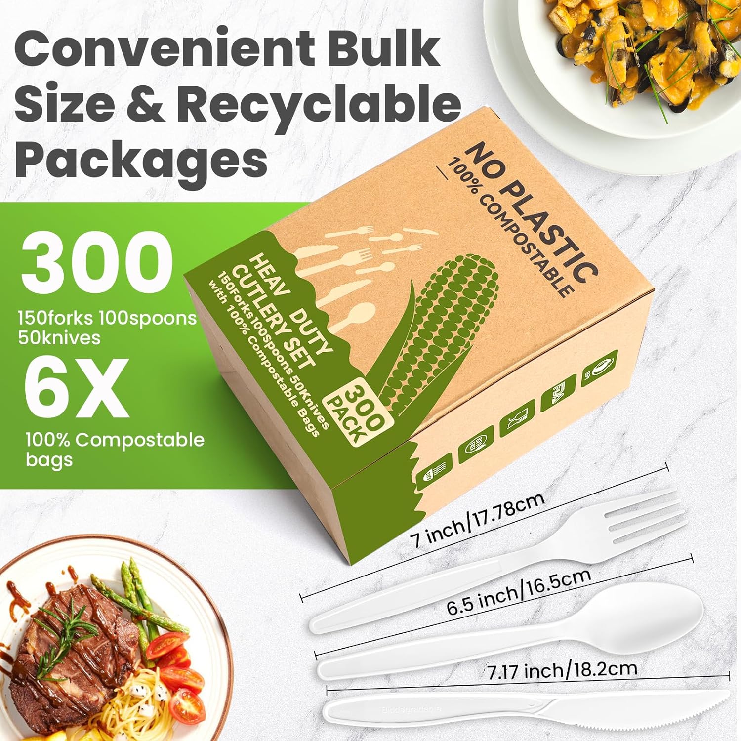Compostable Utensils Set (300Pack), Heavy Duty & Eco-Friendly No-Plastic Spoons, Forks, Knives Cutlery Set - 100% Disposable Cornstarch Flatware for Lounge Party Wedding BBQ Picnic Camping