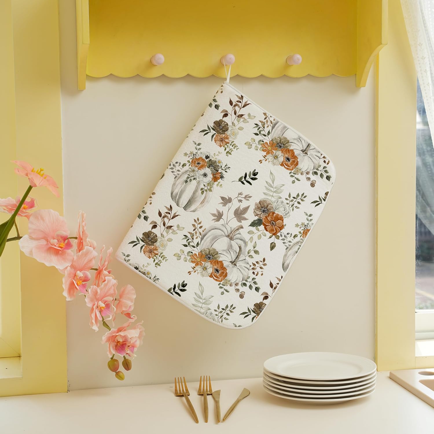 Fall Dish Drying Mat 18 x 24 inch Thanksgiving Autumn Watercolor Pumpkin Maple Leaves Decorative Drying Mats Microfiber Absorbent Dish Washable Draining Mat for Kitchen Counter Decor