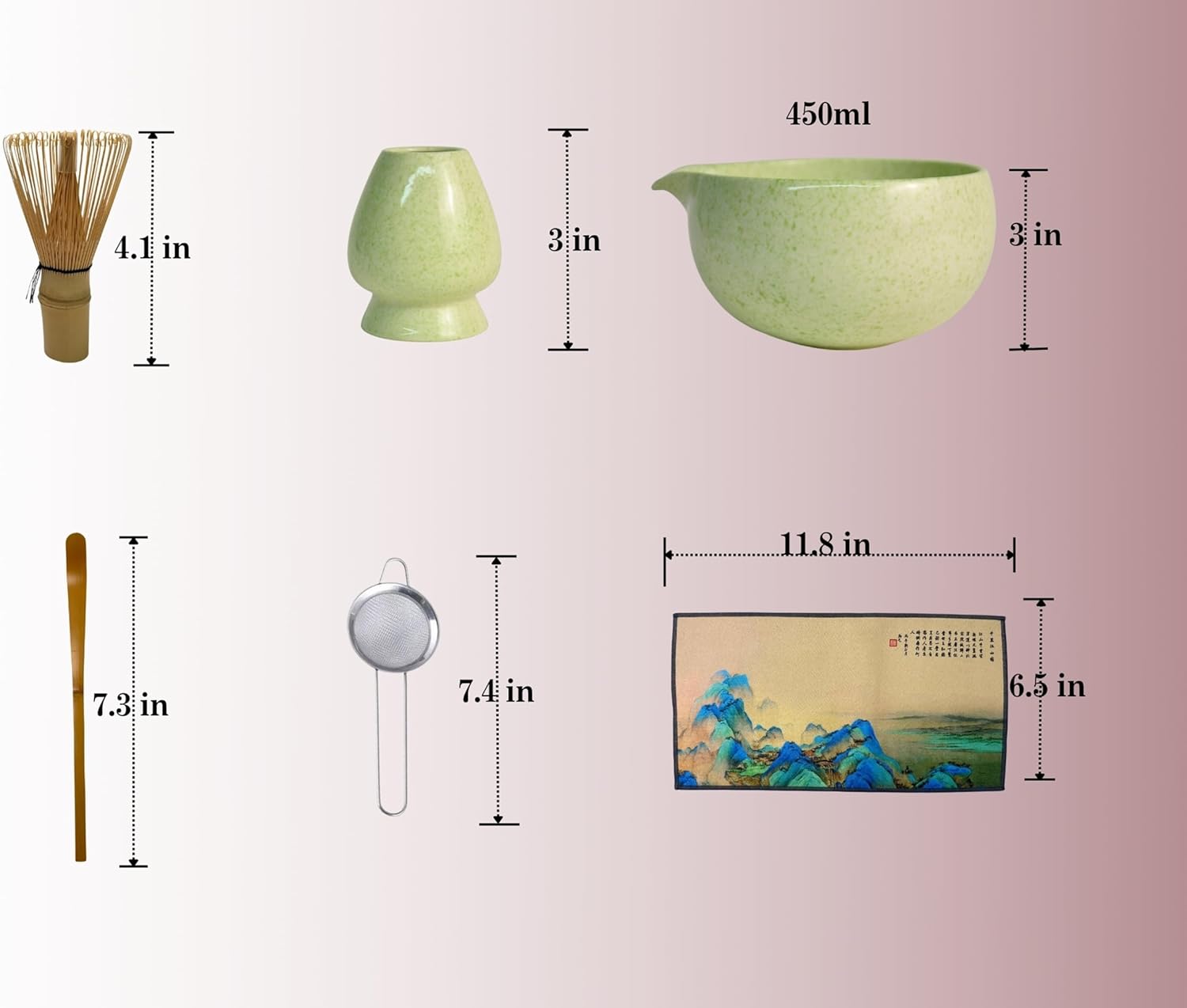 • 【ALL-IN-ONE MATCHA SET】7-pcs complete matcha tea kit includes 1 green matcha bowl(450ml/15fl oz) & 1 whisk holder, 1 handcrafted bamboo matcha whisk, 1 bamboo scoop, 1 scoop rest, 1 fine mesh sifter, and 1 tea towel — everything you need for both beginners and matcha enthusiasts.