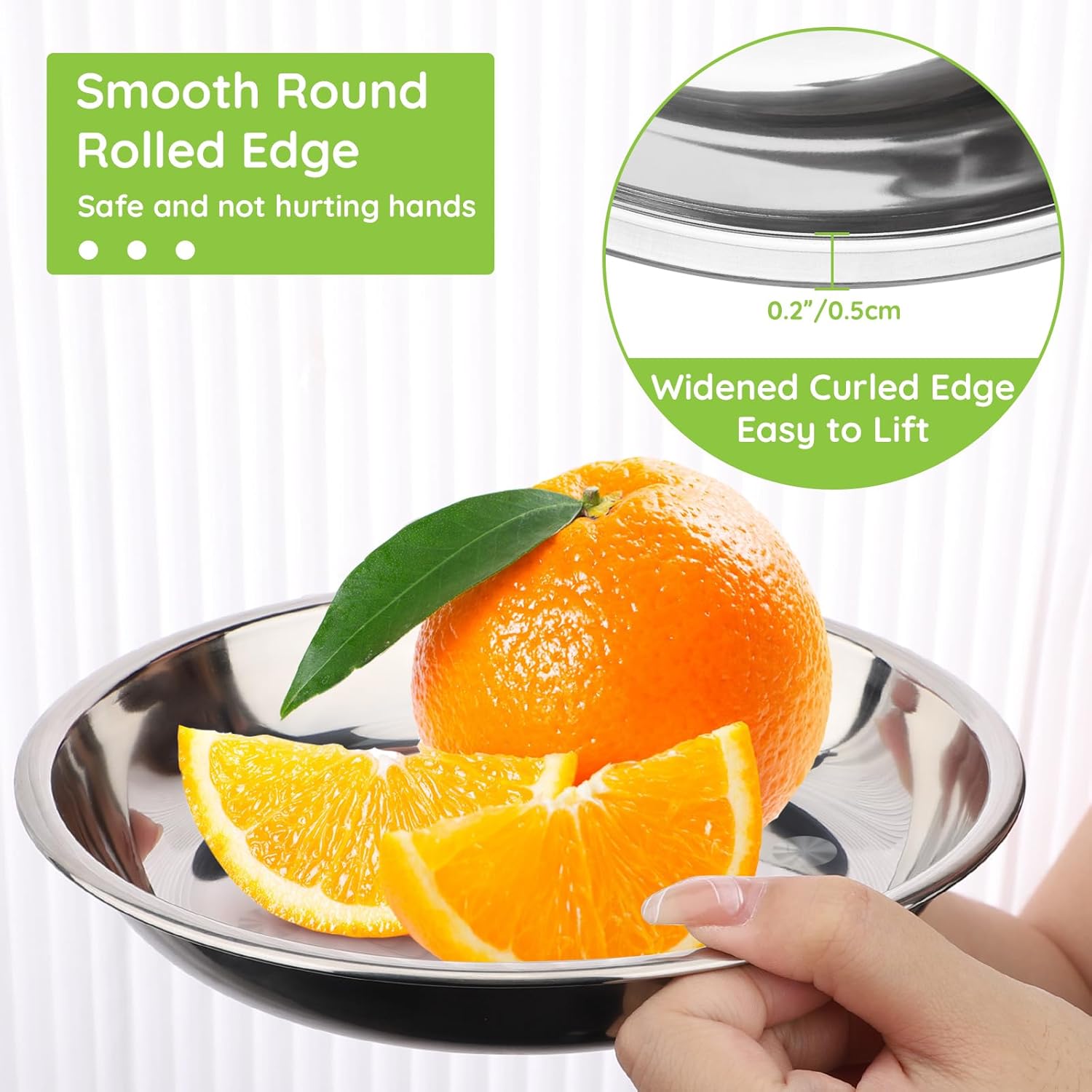 • Sturdy and Shatterproof: This 4 pack of 7 inch stainless steel metal plates is made from 201 stainless steel with a tall lip to help minimize spills, ensuring long-lasting use without breaking or bending. While not microwave-safe, they are oven-friendly and great for heating food, such as placing them over boiling water. Due to their excellent heat conductivity, handle with care when serving hot food. For added stability on smooth surfaces, use a silicone pad to avoid slipping.