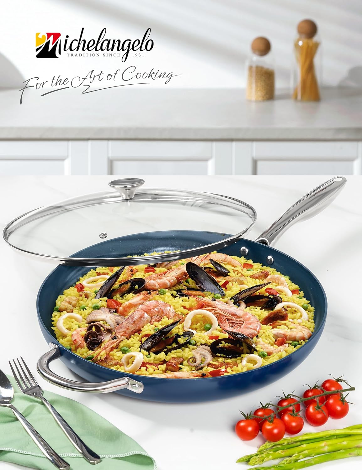MICHELANGELO Large Frying Pan with Lid, 14 Inch Blue Frying Pan with Nonstick Diamond Infused Coating, Nonstick Frying Pans, Ceramic Fry Pan, Non-Toxic