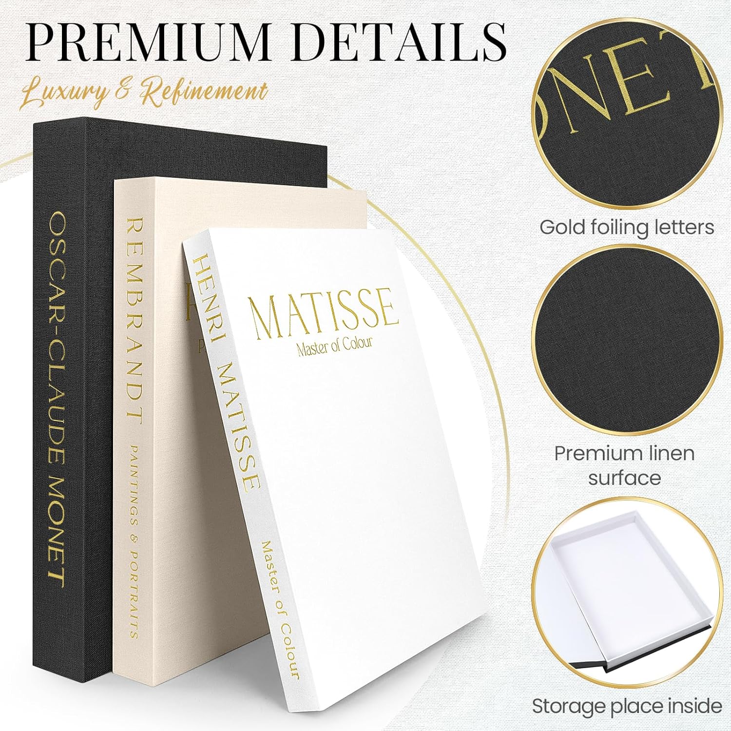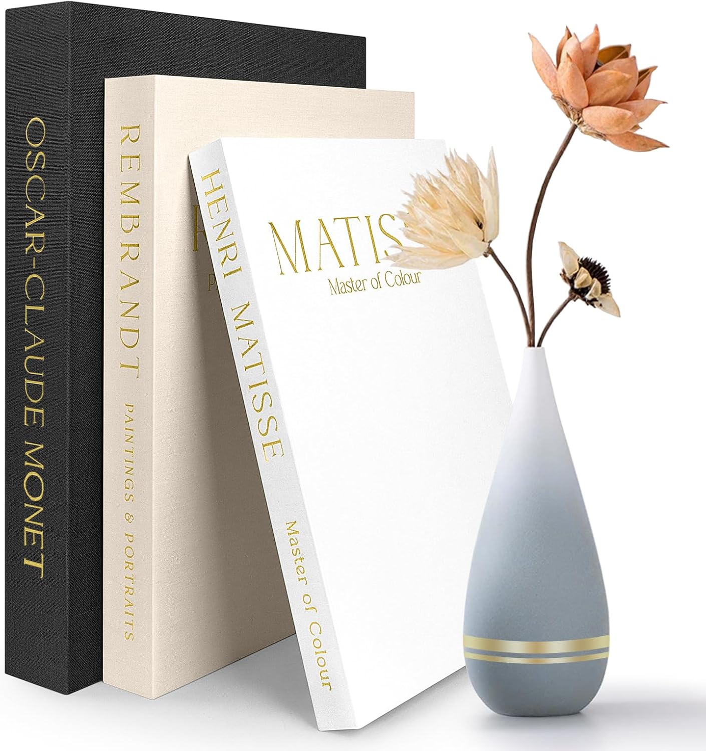 • Elegant Accent for Modern Interiors--Inspired by iconic artistic aesthetics, this set of decorative faux books brings timeless charm to your space. With neutral tones design, they effortlessly complement modern, farmhouse, and minimalist interiors—perfect for coffee tables, bookshelves, mantels, or entryway decor.