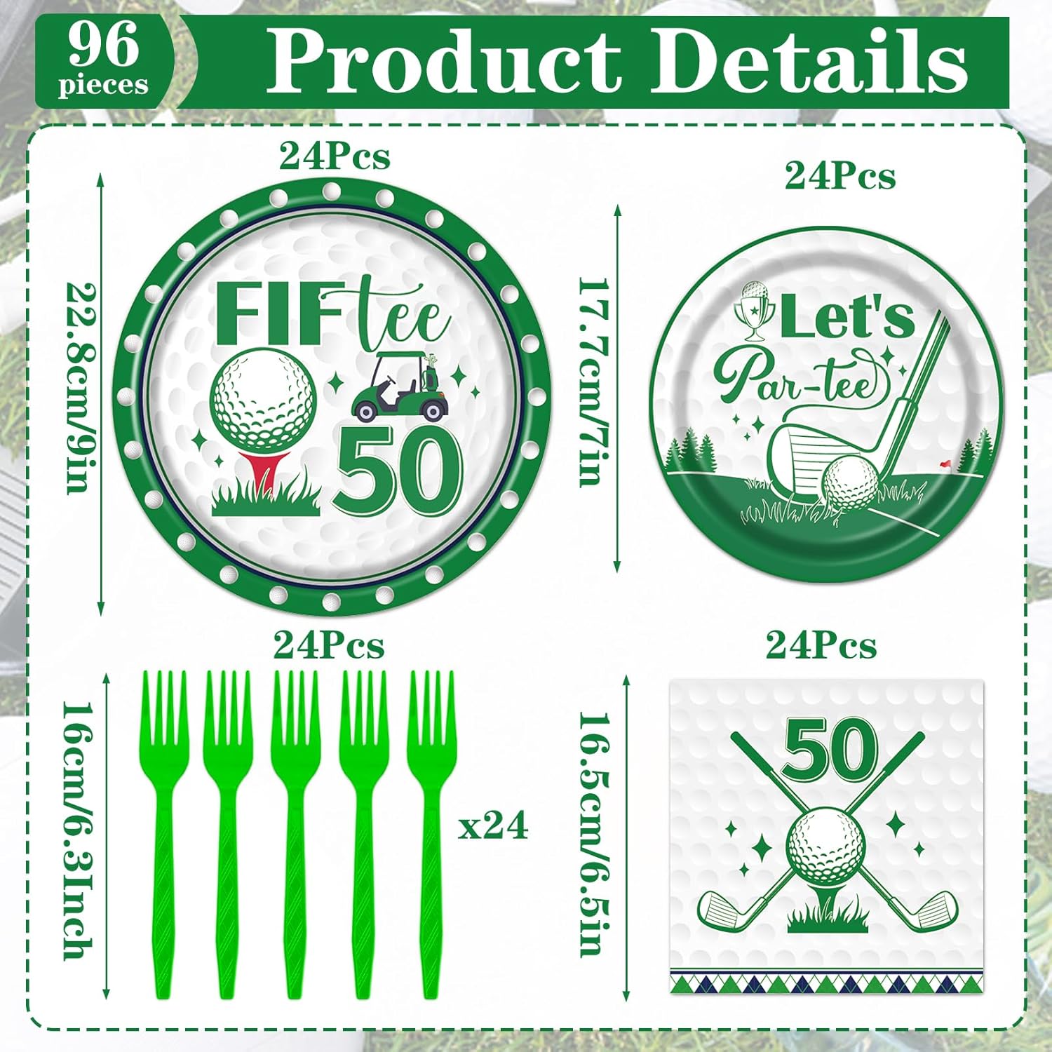 • 50th Golf Party Set: This 96-piece set includes 24 large plates, 24 small plates, 24 napkins, and 24 forks, perfectly serving 24 guests for a memorable 50th birthday celebration