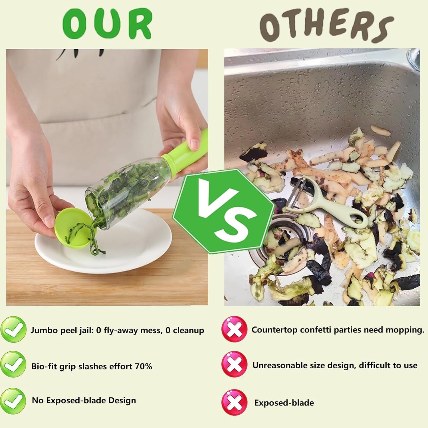 • 【NEW & UPGRADED Design】: Our vegetable peeler now feature a built-in scrap bin – finally stopping those flying peels in their tracks! No more chasing bits around the floor or losing precious minutes to cleanup-Save time,This is the must-have kitchen tool that makes prep work actually enjoyable.