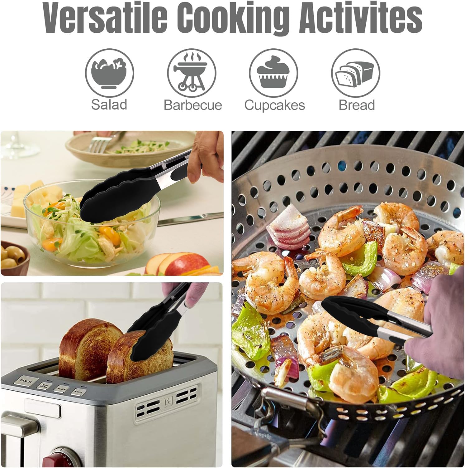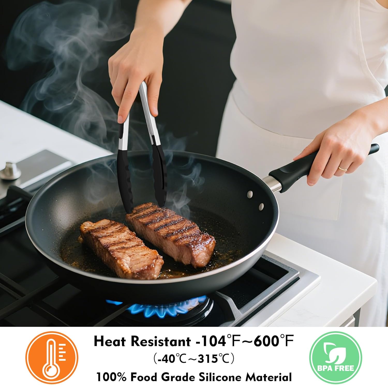 • HEAT RESISTANT ERGONOMIC HANDLES: The cooking tongs' handle is cushioned with silicon, good for thumb rest and ensures good grip and control. Food Silicone-coated tips protect non-stick pans and delicate foods (like fish or pasta) from scratches while providing a firm hold. High temperatures (up to 440°F/227°C) without melting. Easy to rinse, Dishwasher safe.