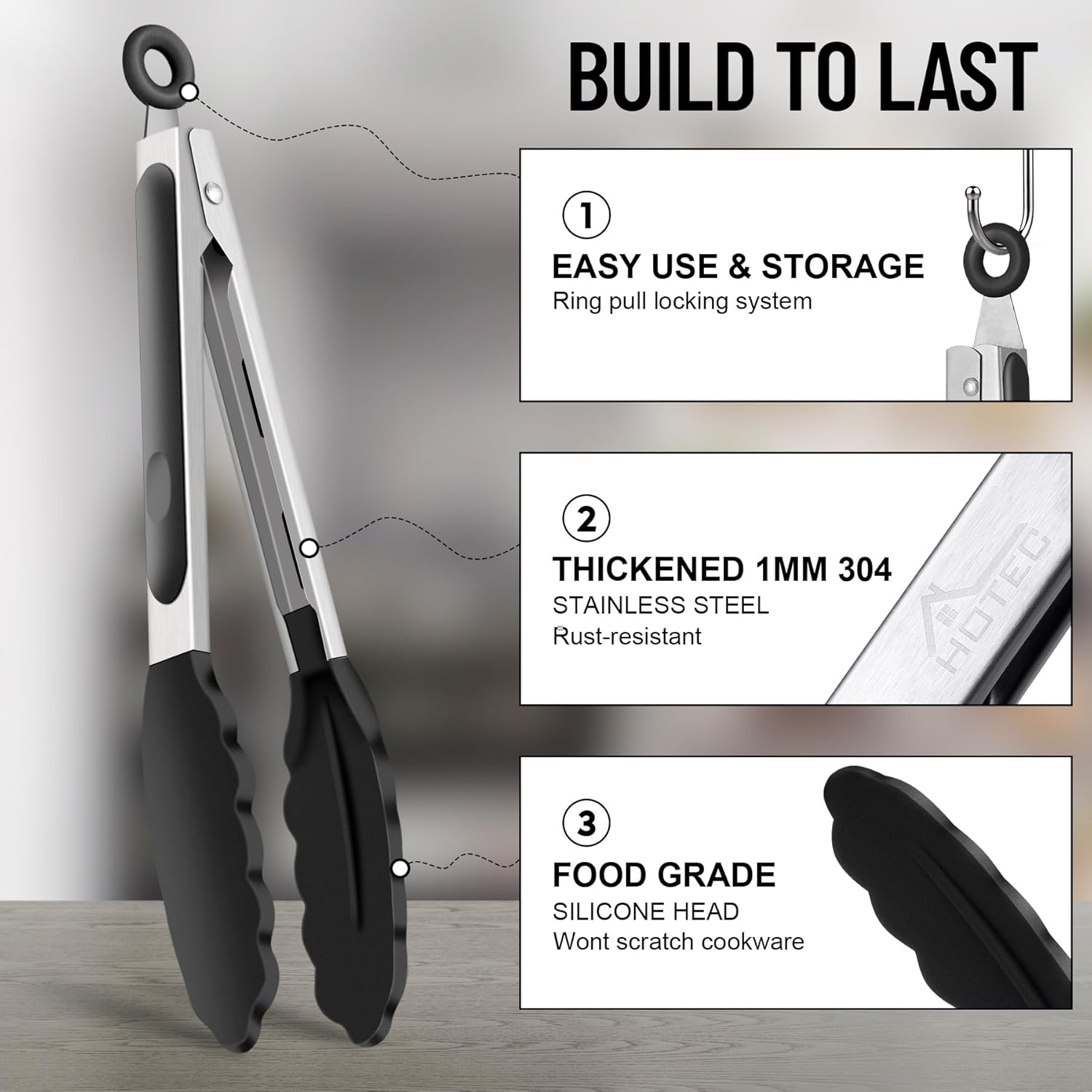 • TOP QUALITY: Hotec kitchen tongs are constructed with 1MM Thickened high quality 304 stainless steel and Food Grade silicon, sturdy, heat resistance, anti-rust, anti-corrosion, light weight, easy to handle, like new forever. This tongs for cooking comes with 2 sizes, 7 and 9 inch. Food safe, Carbonfree Certified.