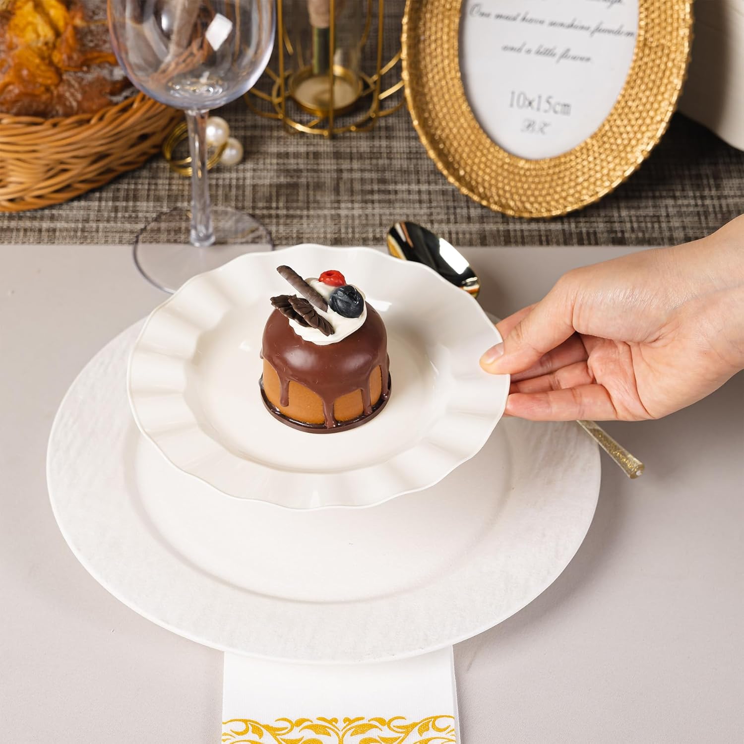 • Elegant design: Delicate wavy edge design dinnerware, simple and luxurious, look like chinaware, which can be paired with any style cutlery, suitable for all party occasions. High quality plastic cutlery is not easy to bend, hand washed and reused.