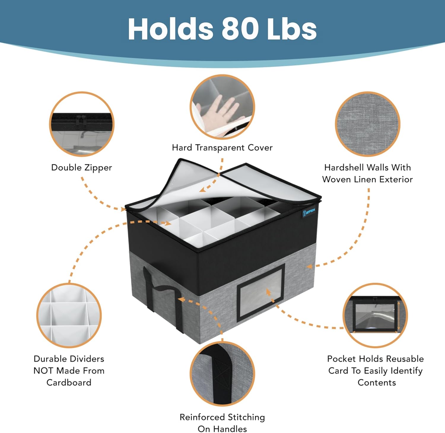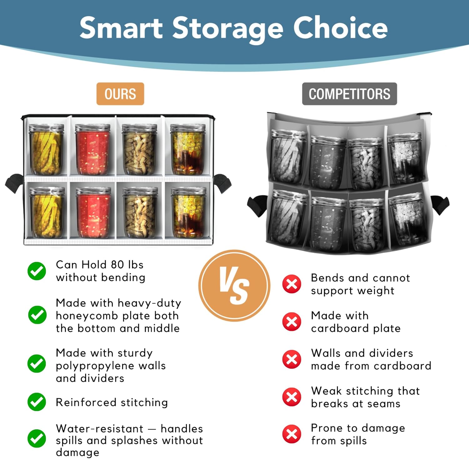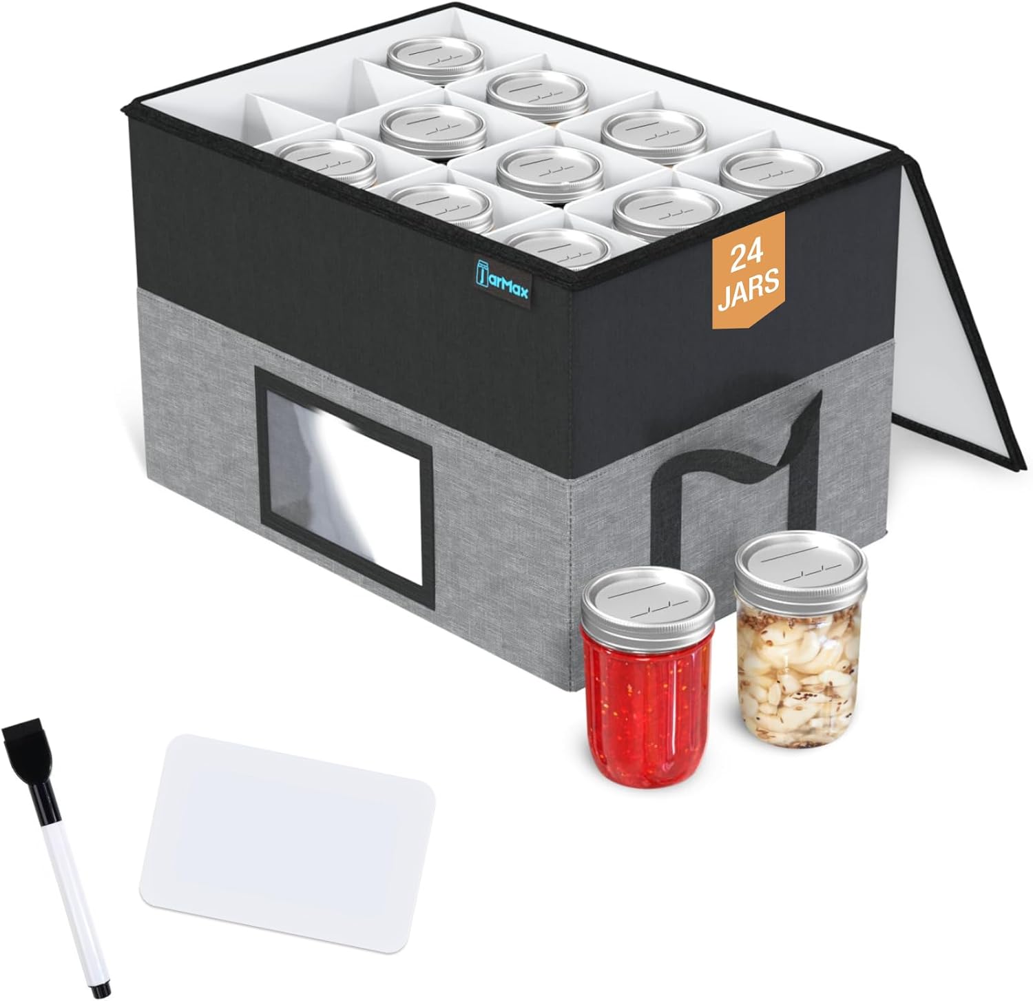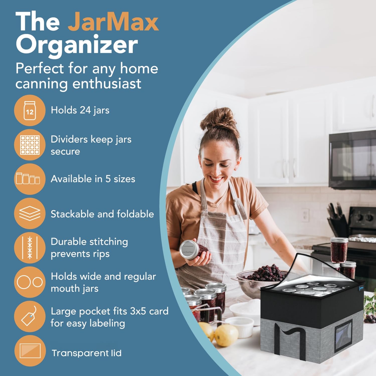 • PREMIUM CANNING JAR STORAGE CONTAINERS – Organize mason jars in the JarMax holder with dividers – holds multiple jars, both wide mouth or regular mouth, for convenient storing in your kitchen pantry or cabinet, packing, stacking, or moving with zipper closure. Can also store smaller jars and other items. Holds 24 pint jars.