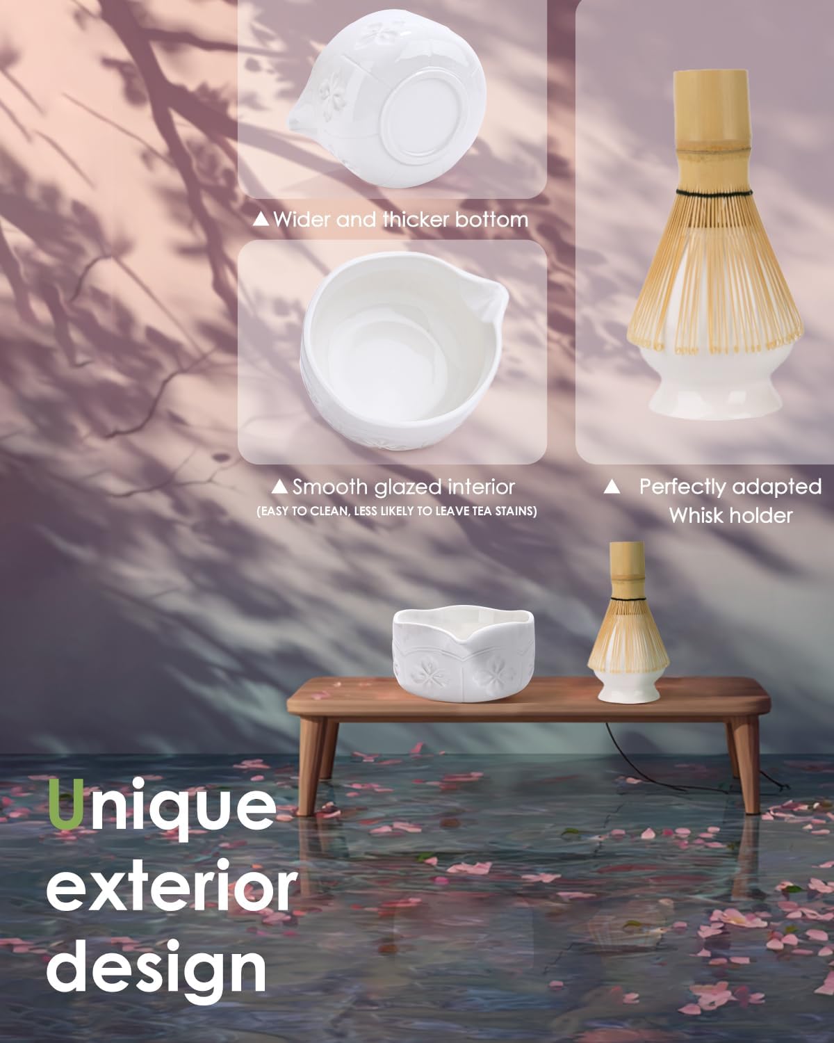 Matcha Whisk Set, Ceramic Matcha Set Includes Matcha Bowl with Spout, Matcha Whisk and Holder, Bamboo Scoop, Sifter and Tea Towel - 6 Pcs Matcha Kit Gift for Matcha Lovers Beginners (White)