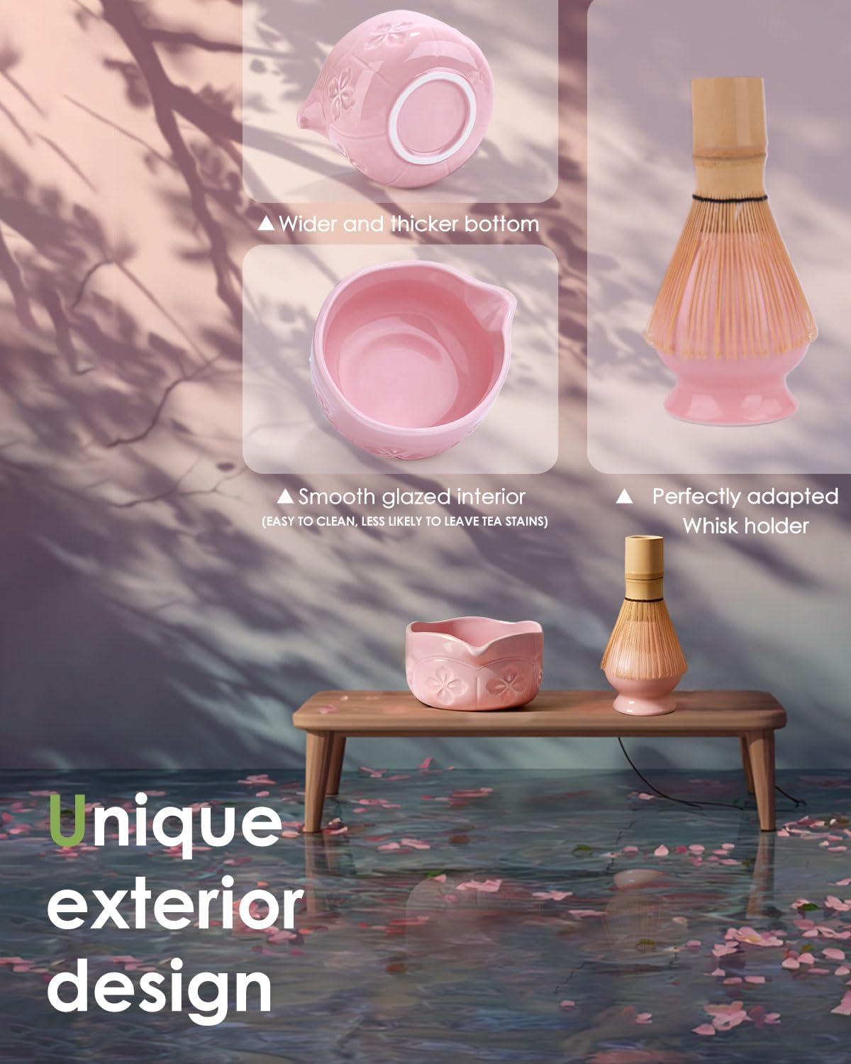 Matcha Whisk Set, Ceramic Matcha Set Includes Bowl with Spout, Whisk and Holder, Bamboo Scoop, Sifter and Tea Towel - 6 Pcs Matcha Kit Gift for Lovers Beginners (Pink)