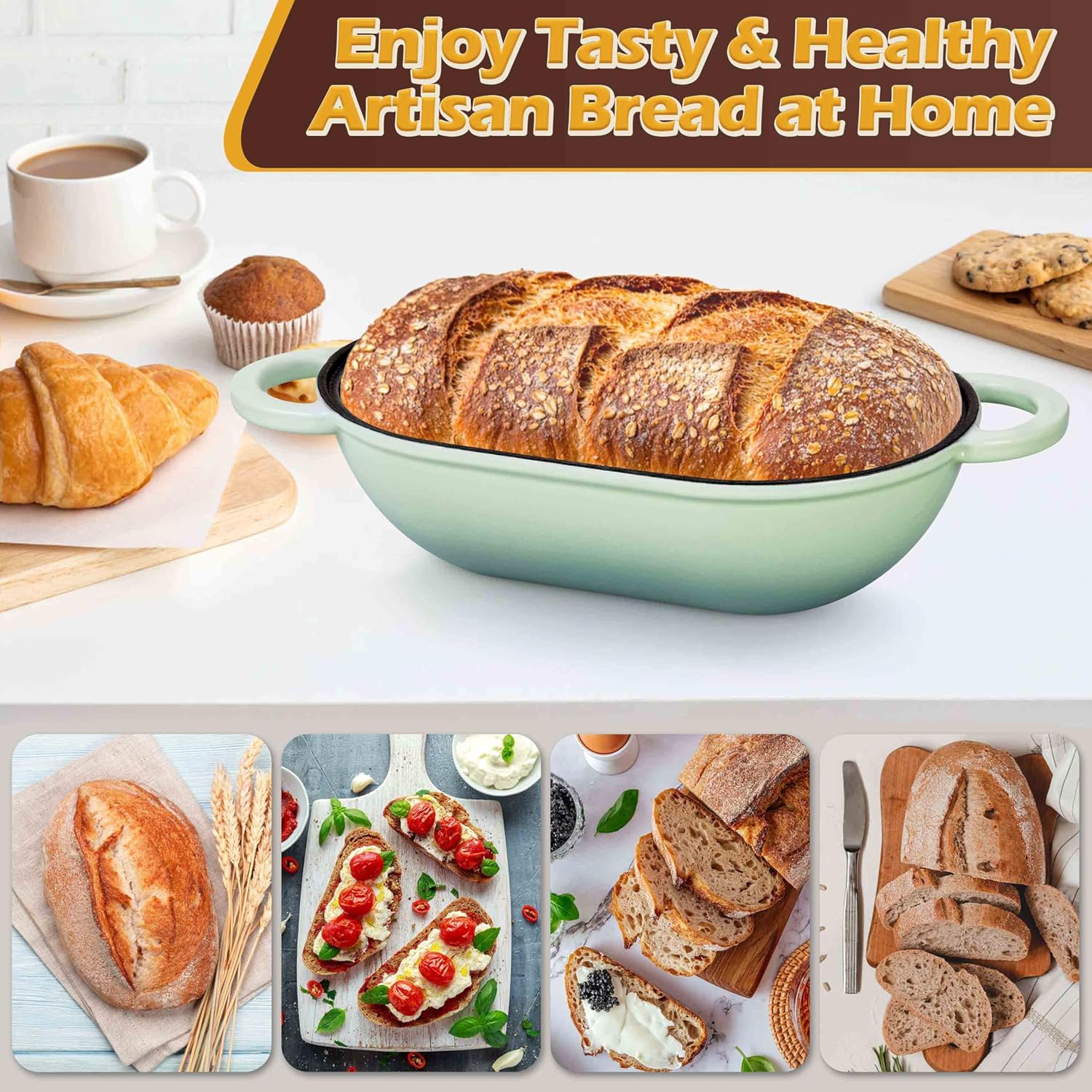 • Versatile use, featured smooth loop handles for secure grip and easy lifting, cast iron dutch oven for sourdough bread baking is easy to from freezer to stovetop or oven to table as a stunning serving piece, ideal for baking bread, cooking casseroles, roasting meat vegetables, the great addition to any kitchen, stylish design and vibrant pistachio green color of iron bread dutch oven adds a touch of elegance to your home