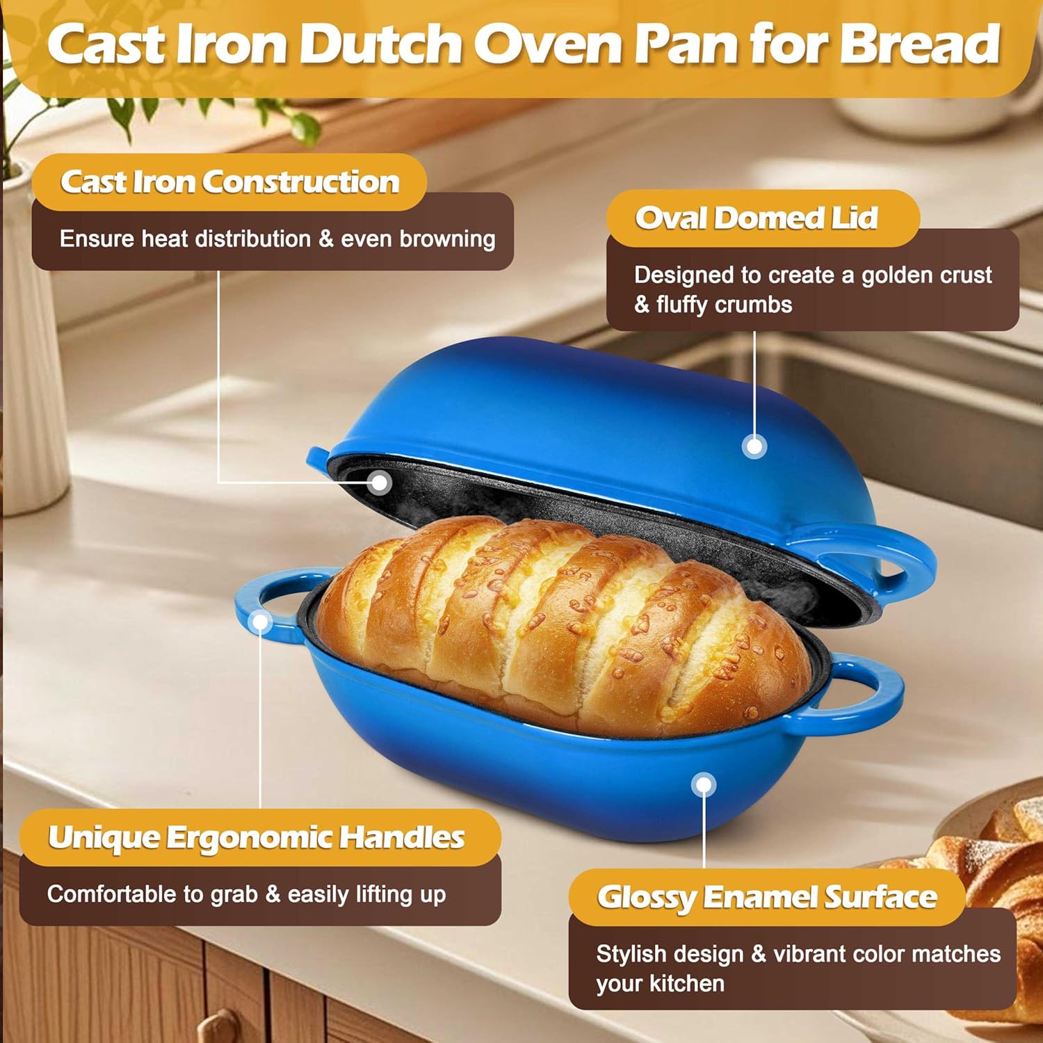 Homikit Enameled Cast Iron Dutch Oven for Bread Baking, 2.8 QT Oval Bread Oven Pot with Lid, Sourdough Loaf Iron Dutch Oven Pan for Roasting Cooking, Blue & Heavy Duty