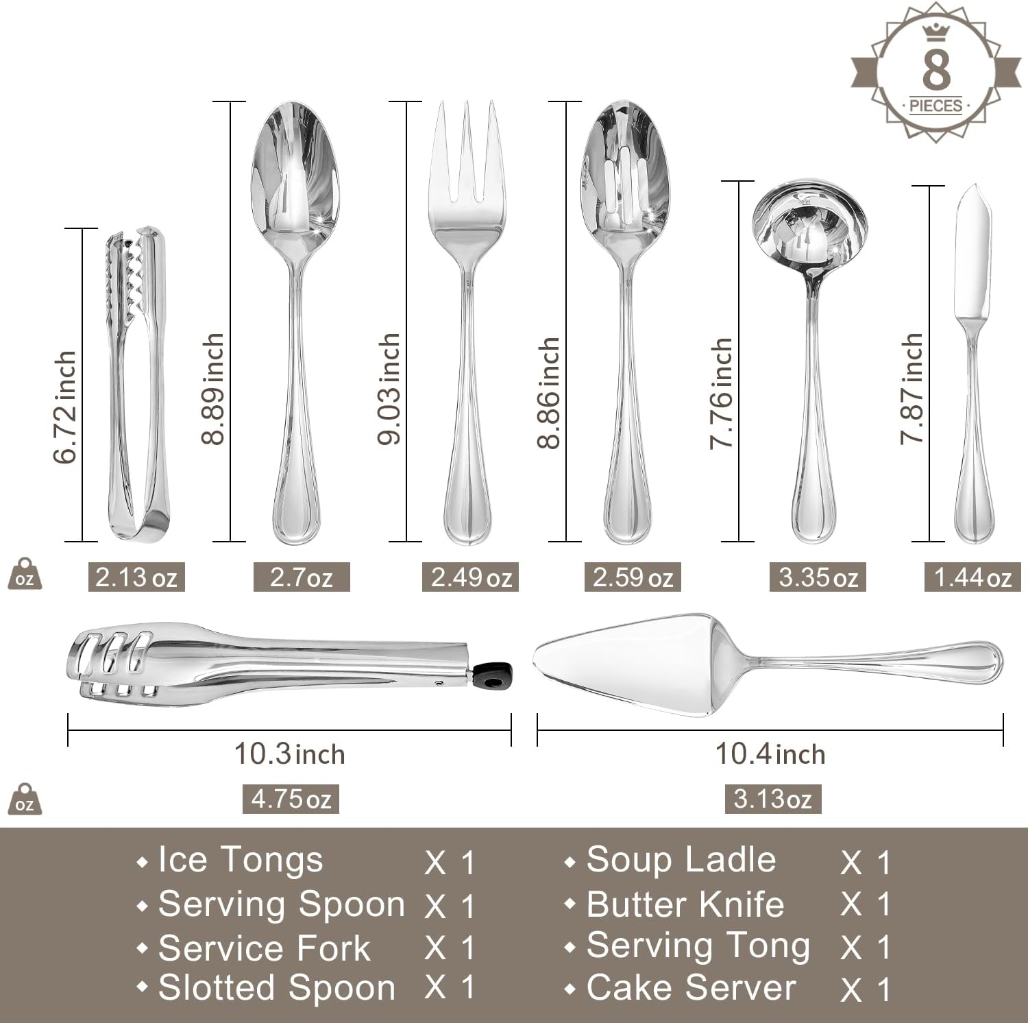 KINGSTONE 8 Piece Teardrop Serving Utensils Set, 18/10 Stainless Steel Serving Utensils, Slotted Spoons, Forks, Tongs, Cake Server, Butter Knife for Buffet, Catering, Wedding, Party