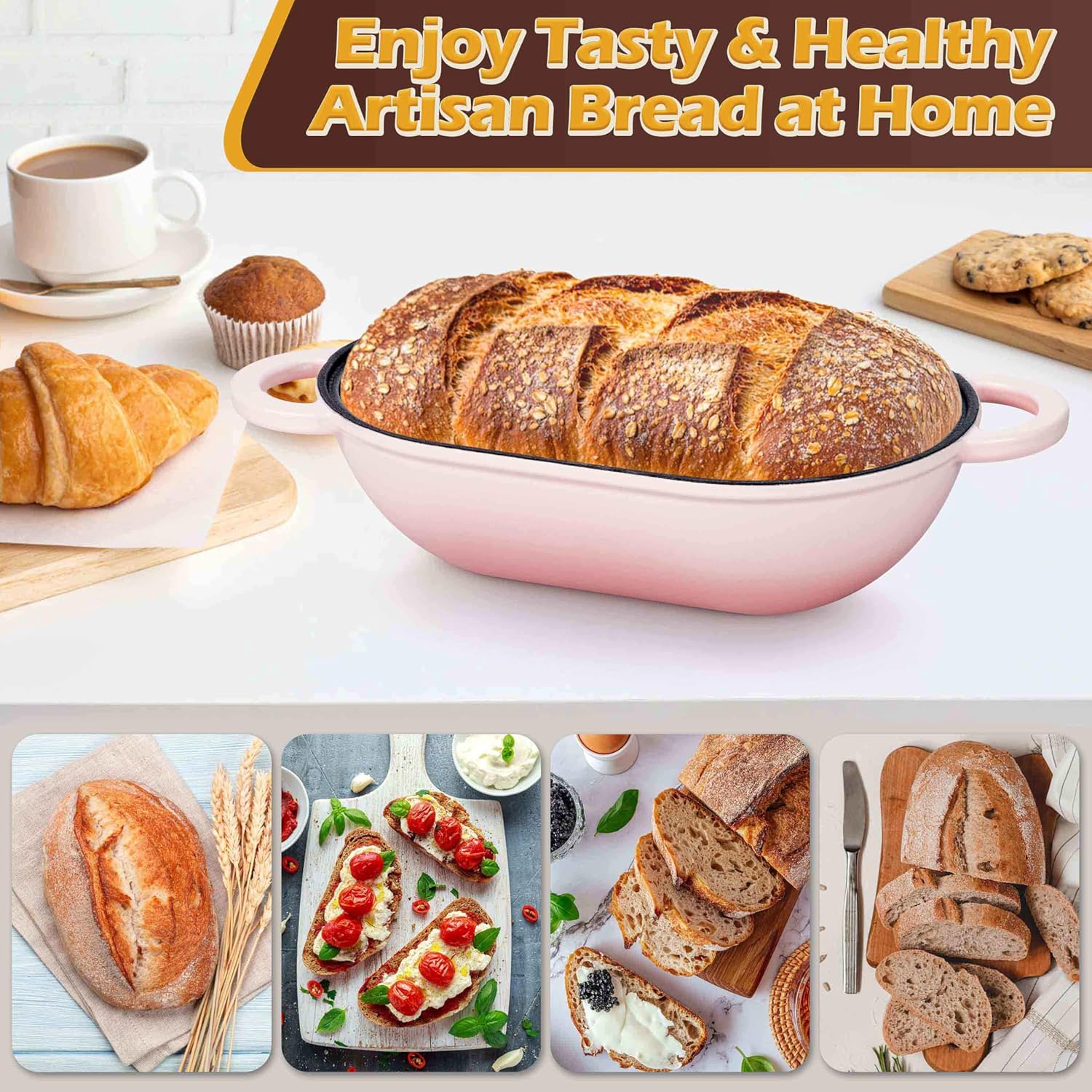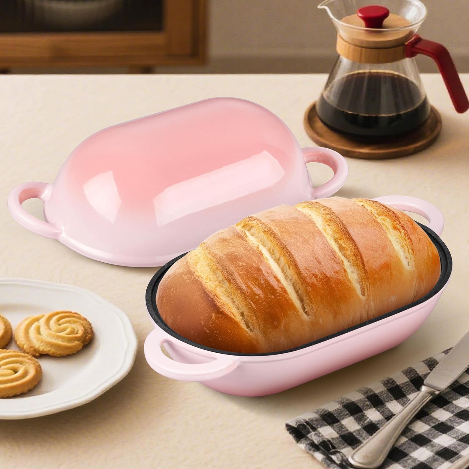 • Versatile use, featured smooth loop handles for secure grip and easy lifting, cast iron dutch oven for sourdough bread baking is easy to from freezer to stovetop or oven to table as a stunning serving piece, ideal for baking bread, cooking casseroles, roasting meat vegetables, the great addition to any kitchen, stylish design and vibrant pink color of iron bread dutch oven adds a touch of elegance to your home