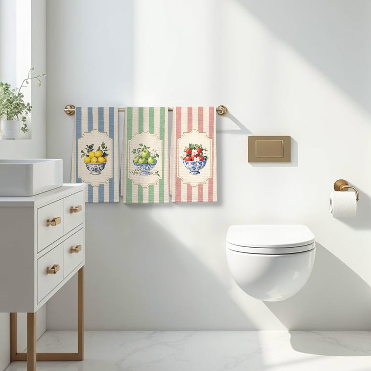 Chinoiserie Floral Fruit Kitchen Towels Set of 3, Retro Striped Lemon Apple Strawberry Dish Tea Towels for Kitchen Decor, Fruit Lover Gifts Decorative Hand Towel, 16x24 Inch