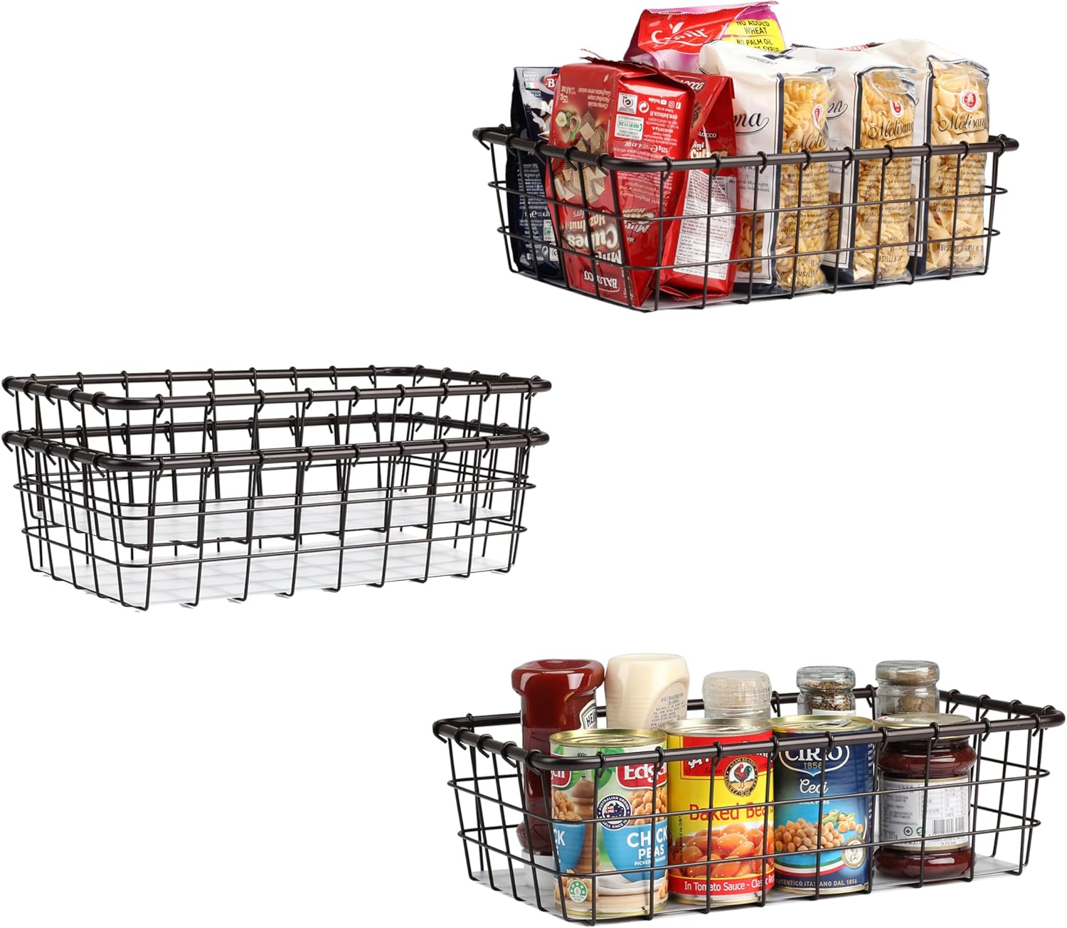 • Industrial-Strength & Rustproof: Made of thick steel wire with matte black powder coating, these wire baskets for pantry use are built for durability and rust resistance. Smooth, burr-free edges protect surfaces and hands.
