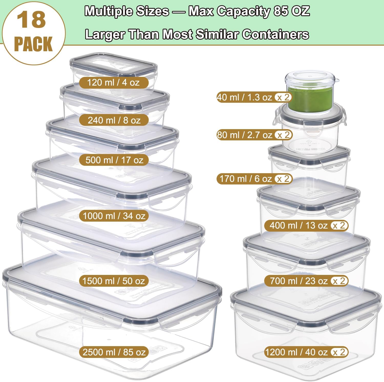 • 18-Pack Versatile Size: Our food storage container set includes 6 rectangular containers (85oz, 50oz, 34oz, 17oz, 8oz, 4oz), 8 square containers (2×40oz, 2×23oz, 2×13oz, 2×6oz), and 4 round sauce cups (2×2.7oz, 2×1.3oz) for all storage needs
