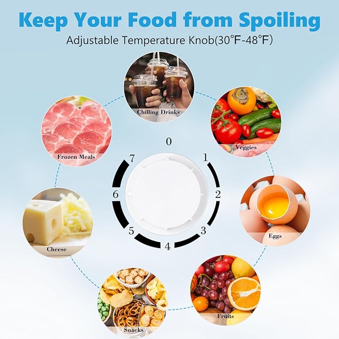 • 🥝𝐀𝐝𝐣𝐮𝐬𝐭𝐚𝐛𝐥𝐞 𝐓𝐞𝐦𝐩𝐞𝐫𝐚𝐭𝐮𝐫𝐞𝐬: This Mini Fridge has a rotary thermostat button inside. The freezer has a temperature range of 30°F to 48°F (not suitable for storing ice cream) and the fridge offers 7 variable temperature settings depending on your needs. Cold storage and larger freezer compartment for storing beverages, fruits, face masks or a small amount of frozen food.