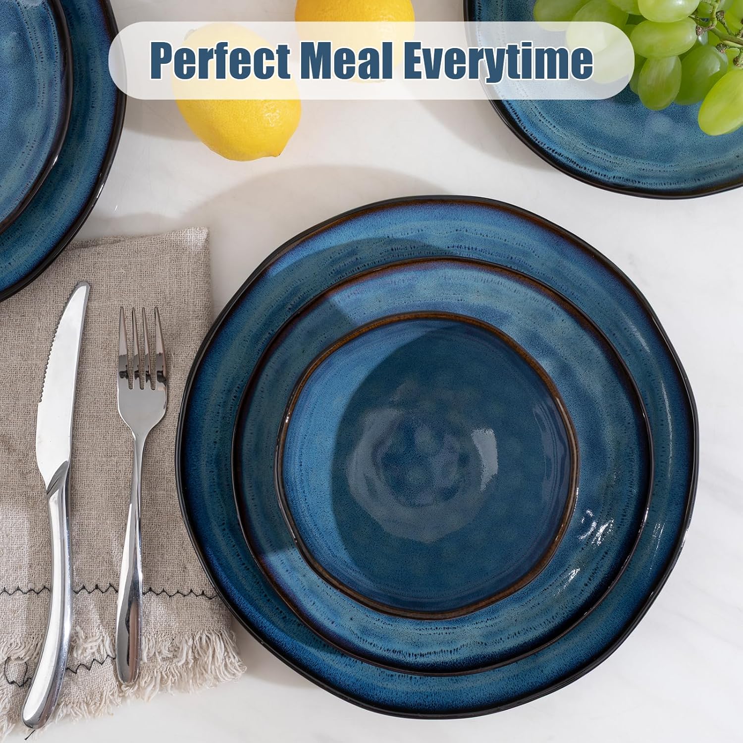 • [Premium Material&Design]: Our plate and bowl sets are made from natural stoneware, and fire the glaze at high temperature. The glazes are food-grade, 100% lead-free, and cadmium-free, so you don't have to worry about health issues, use stylish black and blue color combination, beautiful and generous, the surfaces of plates and bowls have a unique touch, giving you the perfect dining experience.