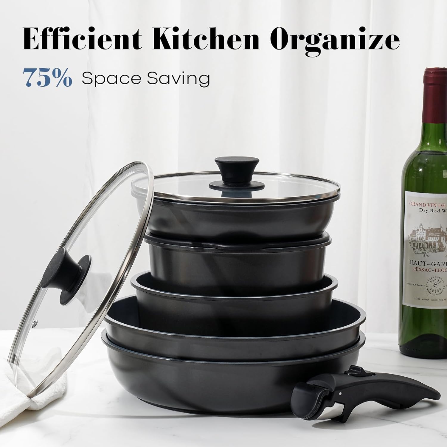 • Space-saving Design - Removable handles of pots and pans set allow for compact stacking, maximizing space savings of up to 75% for cabinets, apartments, RVs, and campers.