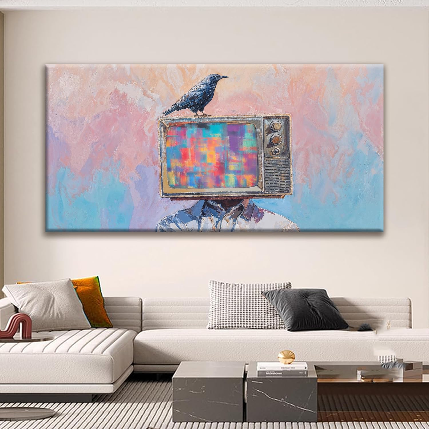 Large Wall Art For Living Room Decor Abstract Crow And Tv Head Art Prints Ready To Hang Room Wall Decor Canvas Wall Art For Office Bedroom Kitchen 29x58 Inch