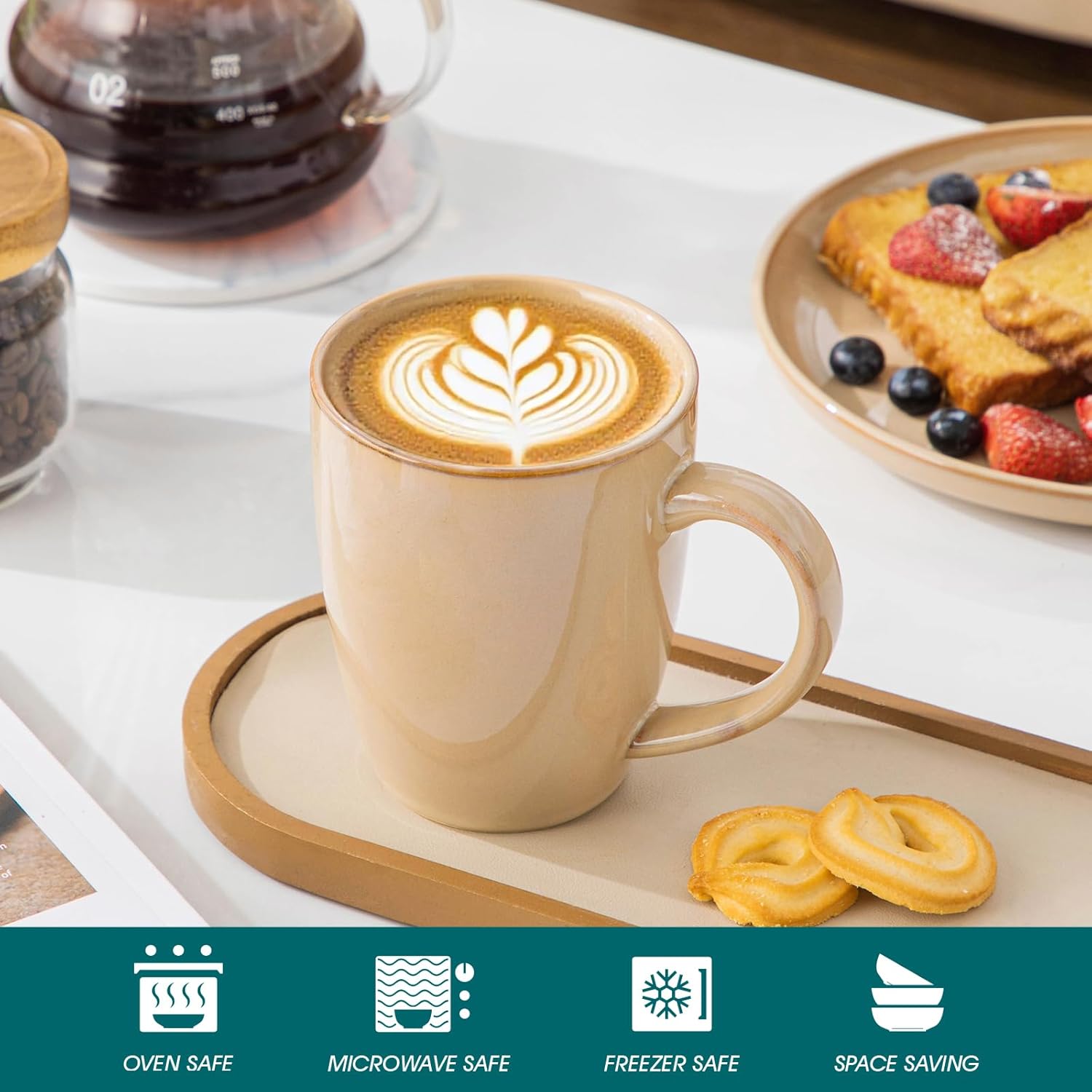 • 【Perfect Size & Easy to Hold】Each mug measures 5.4" wide (including handle) and 4.5" high—large enough for generous servings. The wide, comfortable handle provides a secure grip for any hand size.