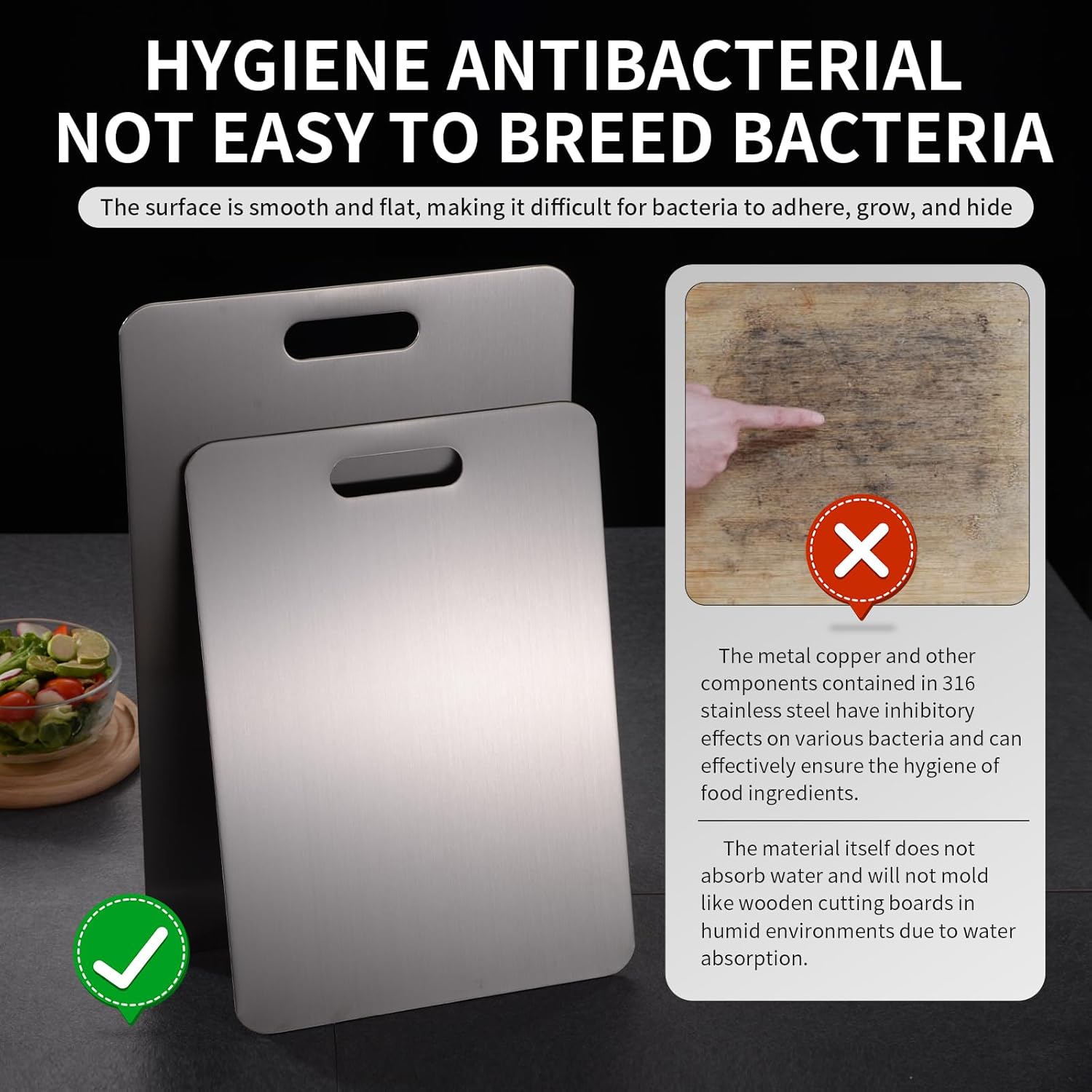 • 【Safety and hygiene】:Titanium cutting board has a smooth surface, which can effectively ensure food safety and make your cooking process more hygienic and reassuring