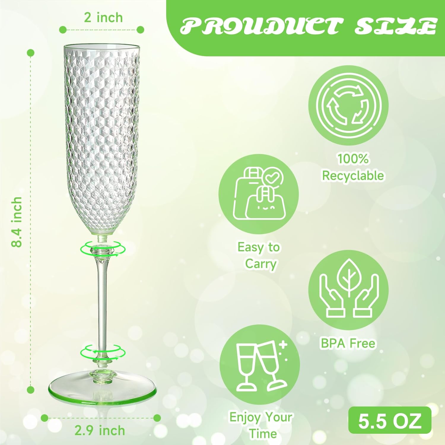 • Sufficient Quantity: The set contains 24 Green detachable Stemware plastic champagne glasses, each measuring approximately 2.87x8.43 inches with a capacity of 5.5 ounces. These champagne glasses are suitable for various drinks, such as champagne, whisky, red wine, sparkling cocktails, mojitos, liquors.