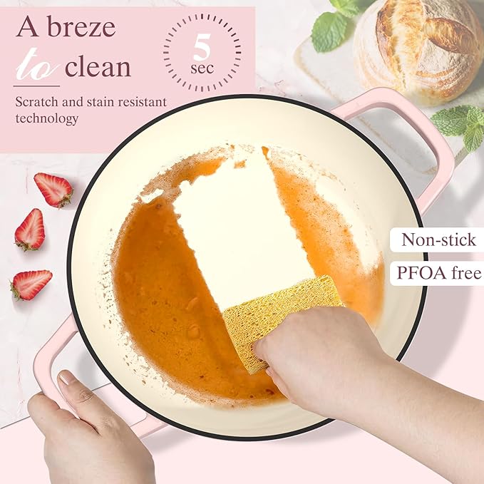 • Enamelled Finish & Easy Cleaning: - The enamelled surface of the cast iron dutch oven pot is resistant to staining, chipping, and odors. It resists rust and scratches, ensuring your enamelled bread pot remains in pristine condition for years. It provides a non-stick surface that makes cleanup a breeze after baking bread or cooking family meals. Simply use warm soapy water!