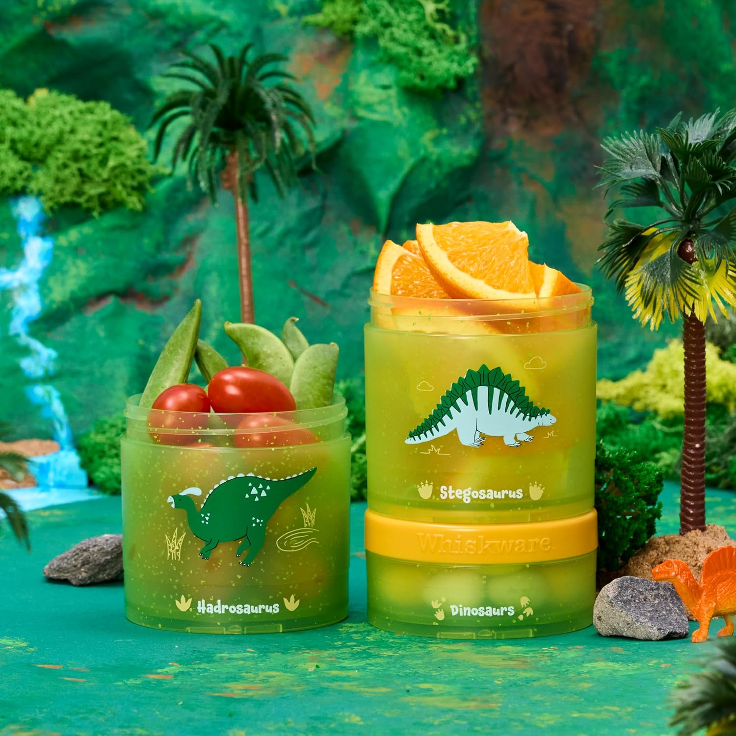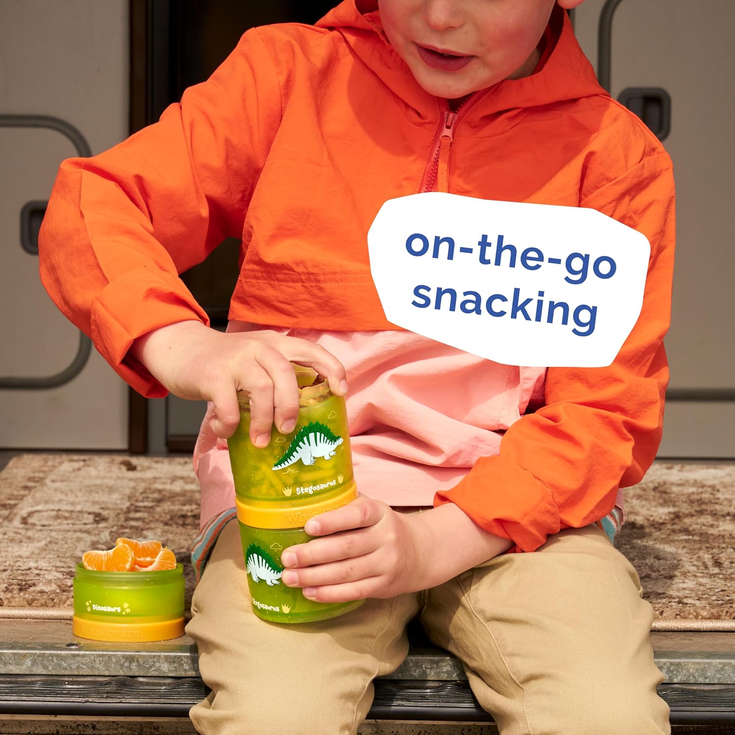 Whiskware Dinosaur Stackable Snack Containers for Kids and Toddlers, 3 Stackable Snack Cups for School and Travel, Green/Orange