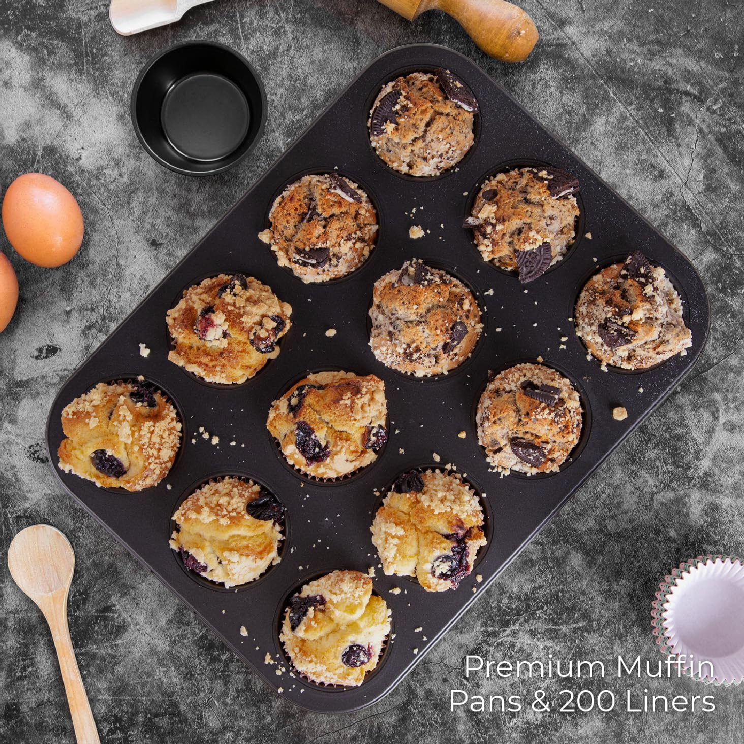 • 𝗖𝗼𝗺𝗽𝗹𝗲𝘁𝗲 𝗠𝘂𝗳𝗳𝗶𝗻 𝗕𝗮𝗸𝗶𝗻𝗴 𝗦𝗲𝘁 – Includes two standard 12-cup muffin pans (muffin tins) and 𝟮𝟬𝟬 𝗯𝗼𝗻𝘂𝘀 cupcake liners for baking, giving you everything you need without extra shopping.
