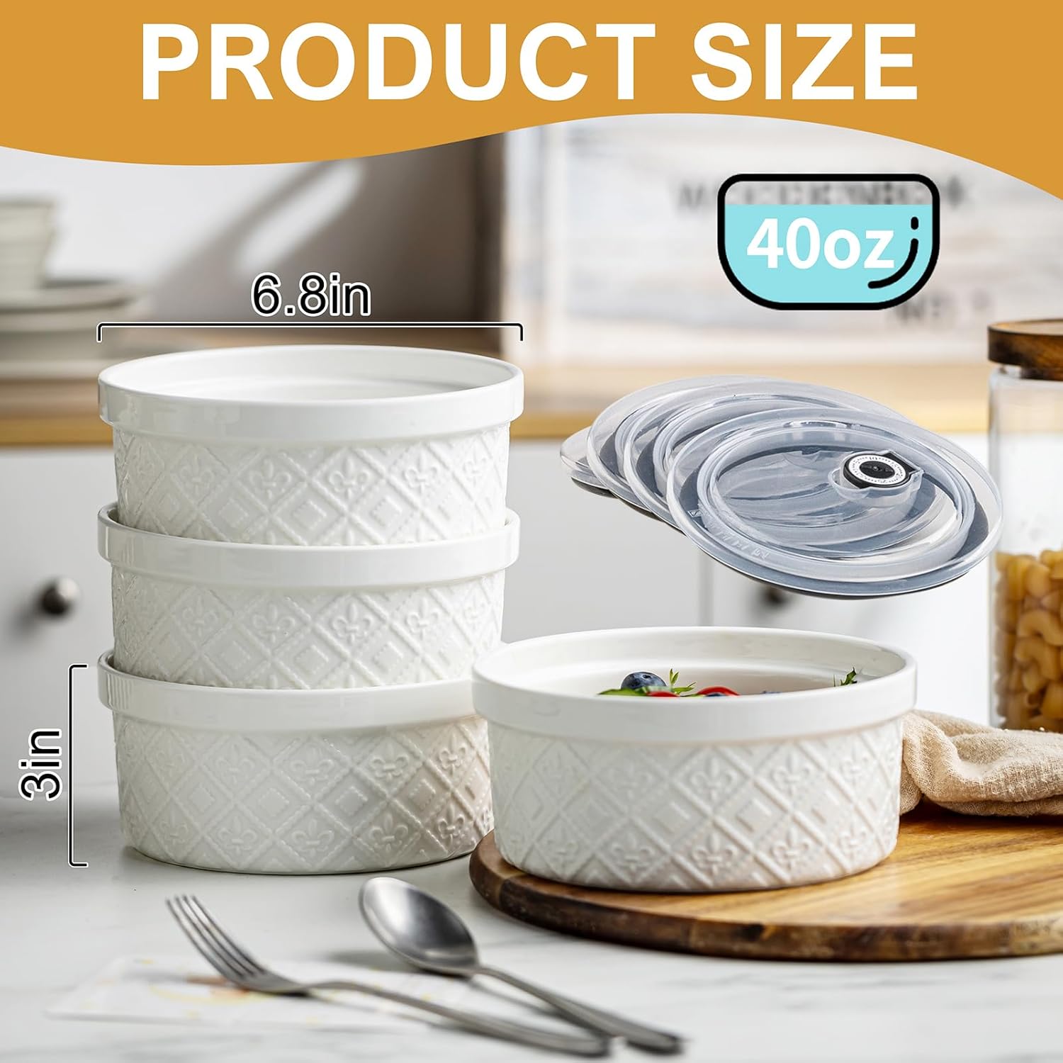 40oz Large Ceramic Mixing Bowls with Lids Set of 4, Ramekin Bowls Oven Safe, Serving Bowls with Lids, Meal Prep Containers, Airtight Food Storage Containers Set for Housewarming, White