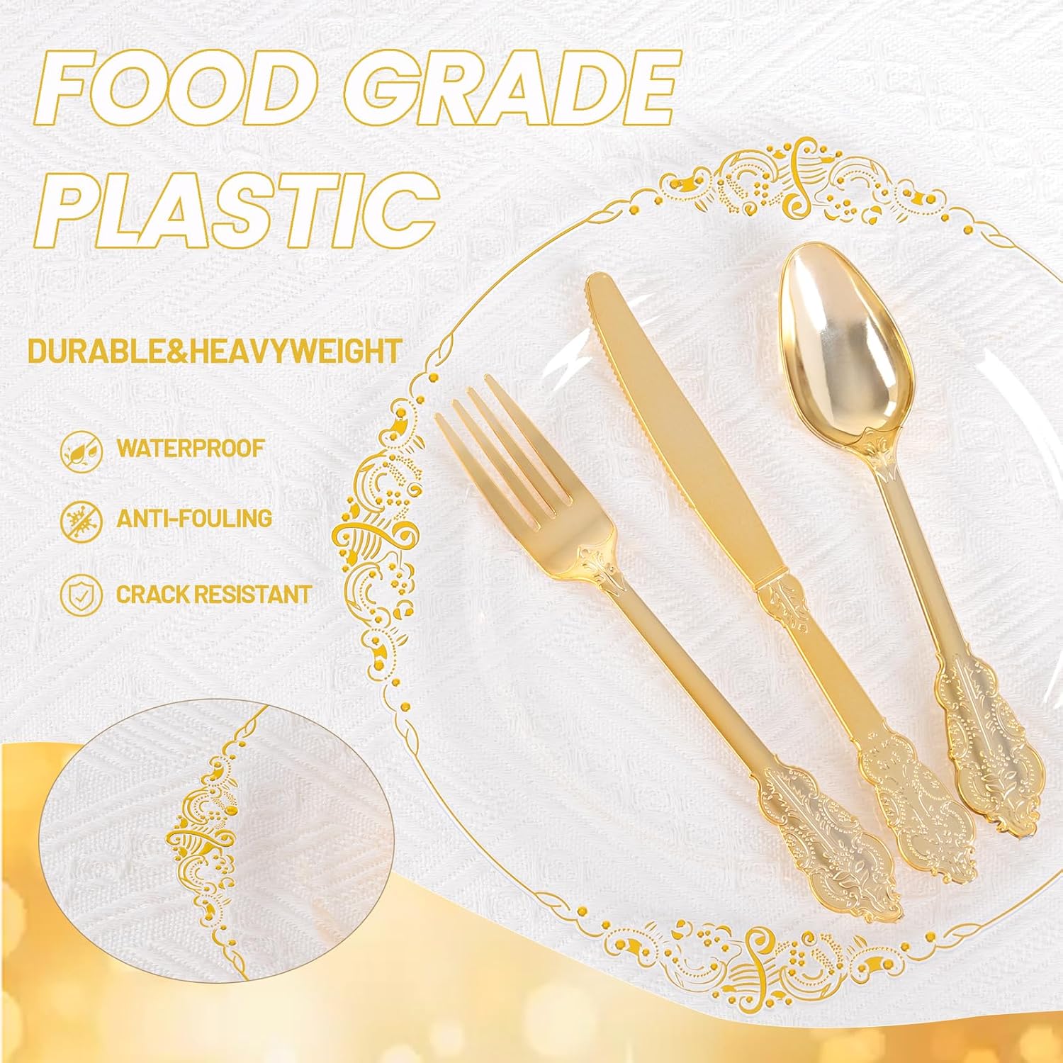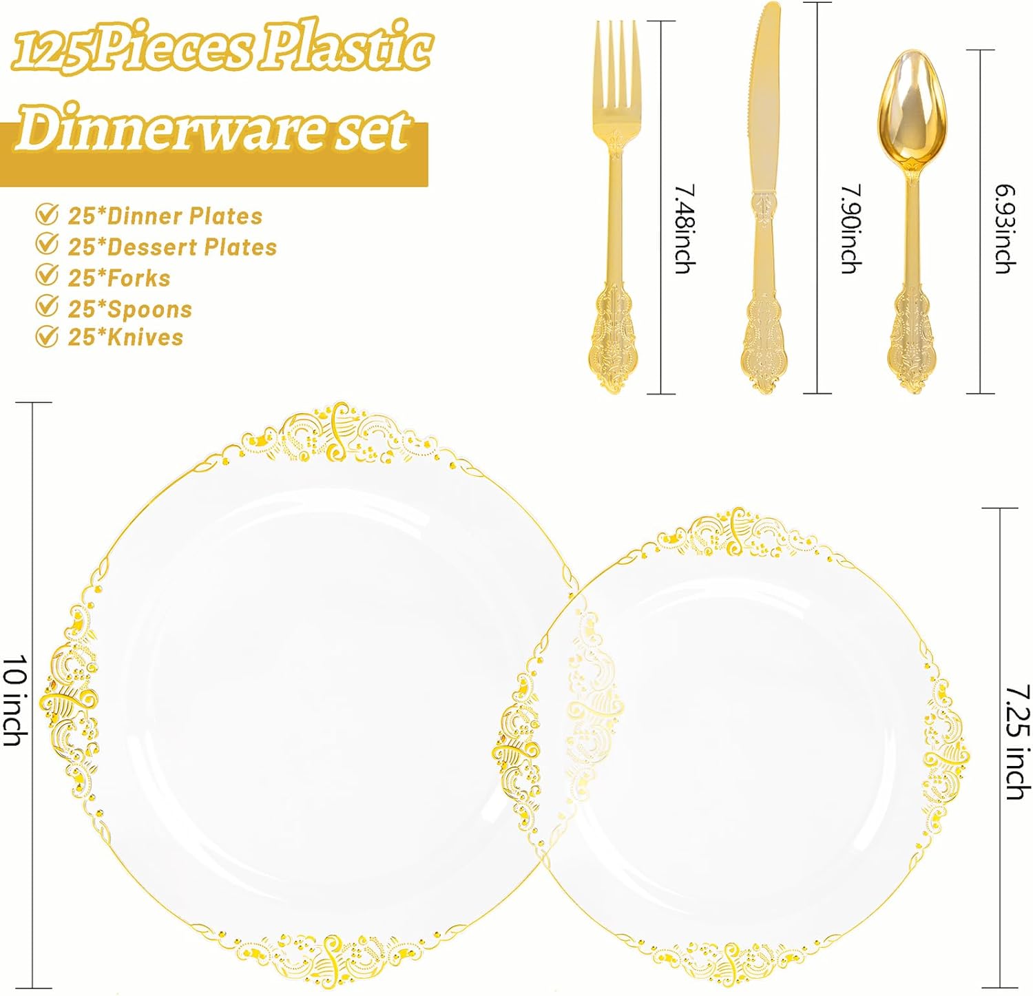 • Value Package: The clear plastic plates with gold trim include 25 clear dinner plates (10 inches) and 25 clear dessert plates (7.25 inches), paired with 75 pieces of gold silverware disposable sets for a complete dining experience