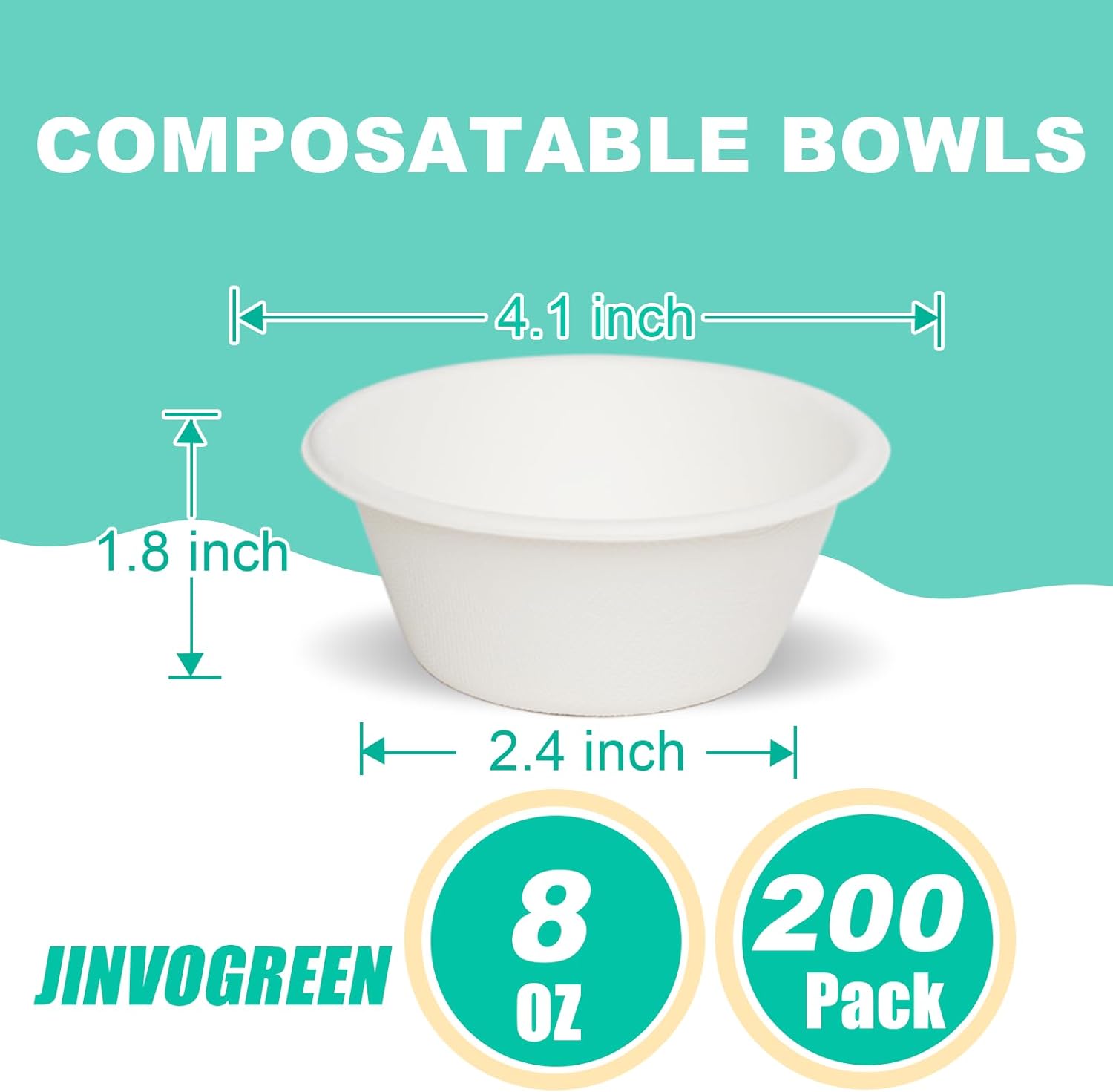 200 Count 8 oz Paper Bowls, Small Disposable Compostable Bowls, Heavy Duty Biodegradable Sugarcane Bagasse Bowl for Snacks, Fruits, Desserts, White