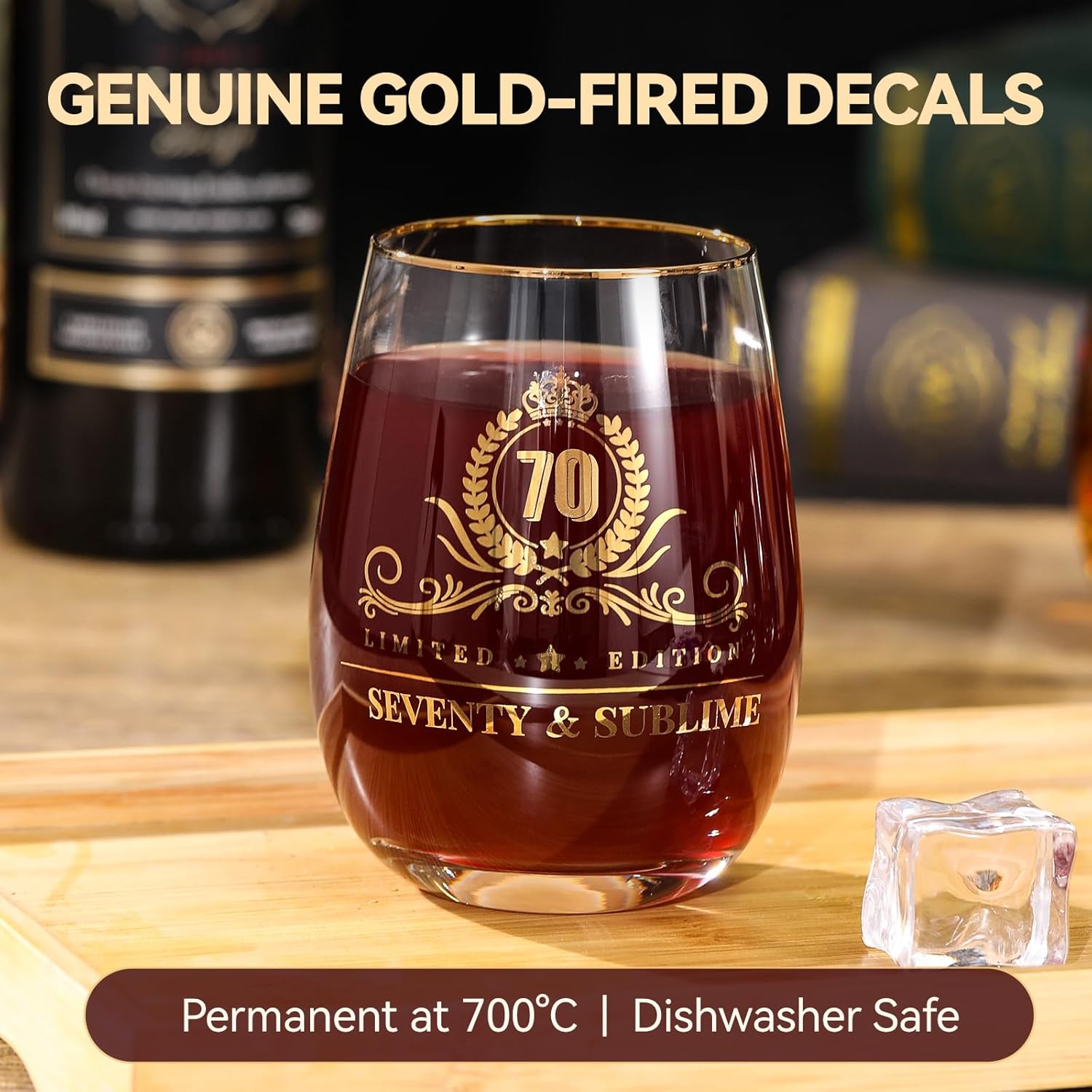 70th Birthday Gifts for Women - Gold Accent Stemless Wine Glass with Premium Gift Box and Blank Card, Meaningful 70 Year Old Gifts for Grandma, Mom, Matriarch (Seventy & Sublime)