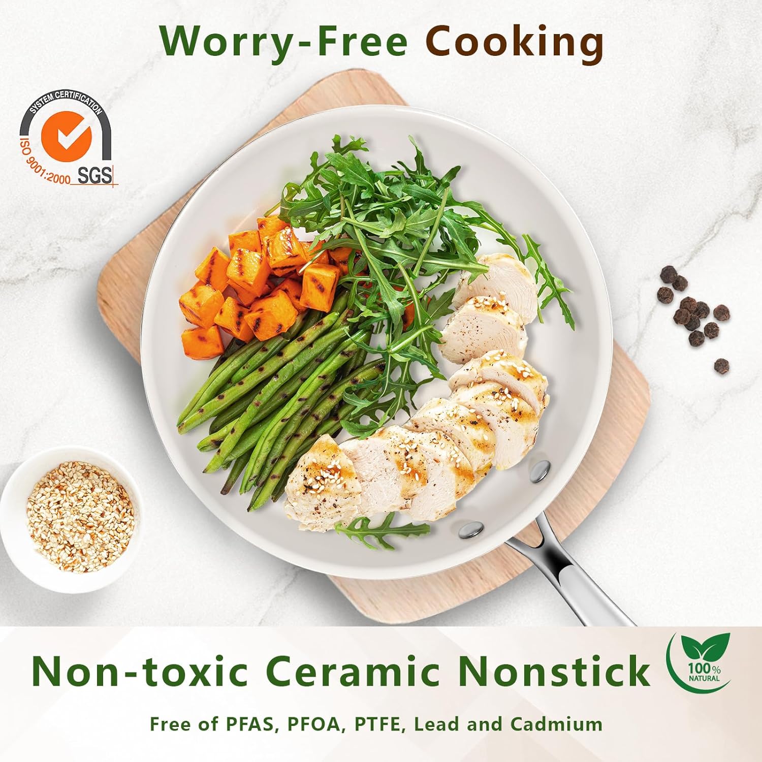 • Advanced Ceramic Nonstick Coating: Enjoy effortless cooking with our premium PFOA-, PTFE-, and PFAS-free ceramic coating, rigorously tested and SGS-certified non-toxic. Designed for healthier frying, our pan requires minimal oil and reduces smoke, keeping your meals safe. For best results, use low to medium heat to preserve the coating’s nonstick properties.