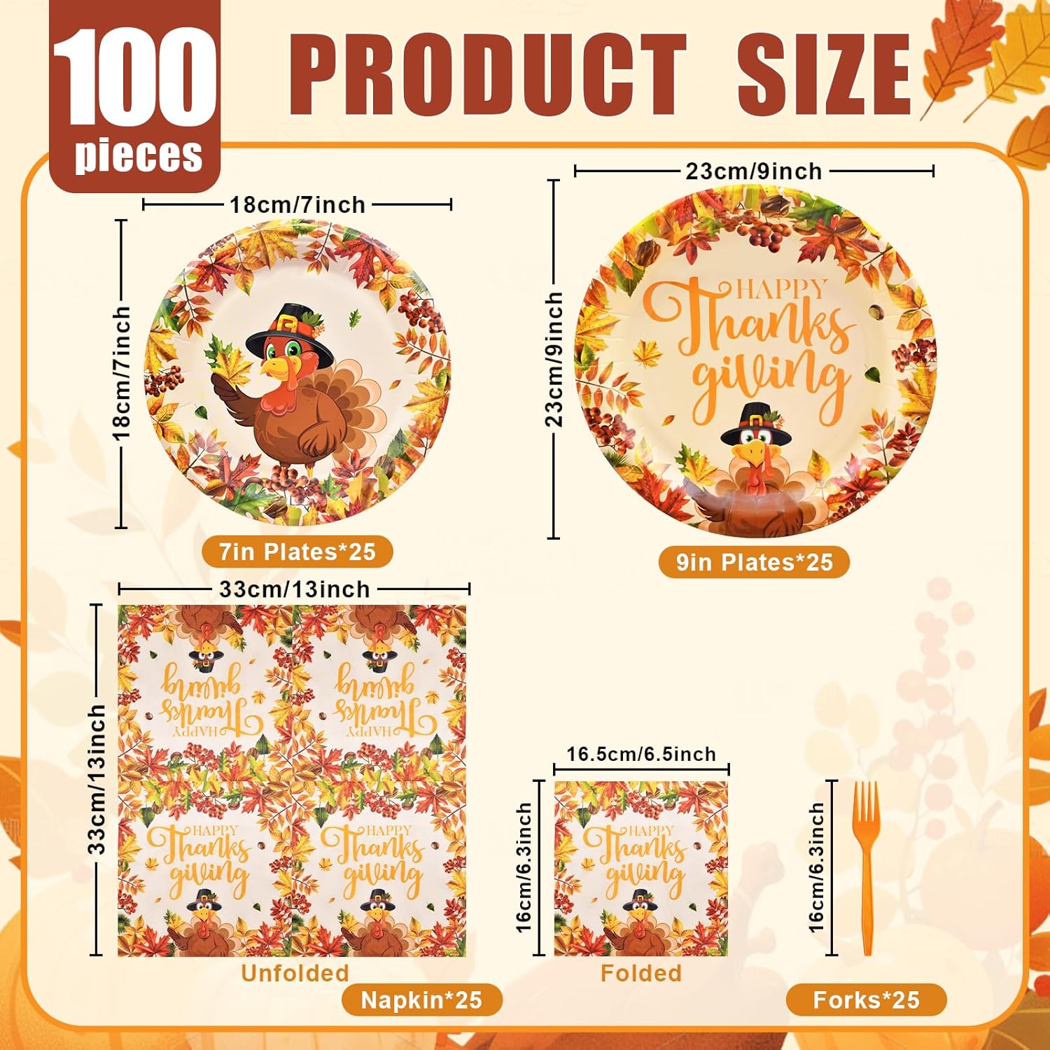100 Pcs Thanksgiving Turkey Tableware Party Supplies – Disposable Fall Dinnerware Set with Paper Plates, Napkins, and Forks for Autumn Celebrations, Friendsgiving, and Thanksgiving Dinner – Serves 25