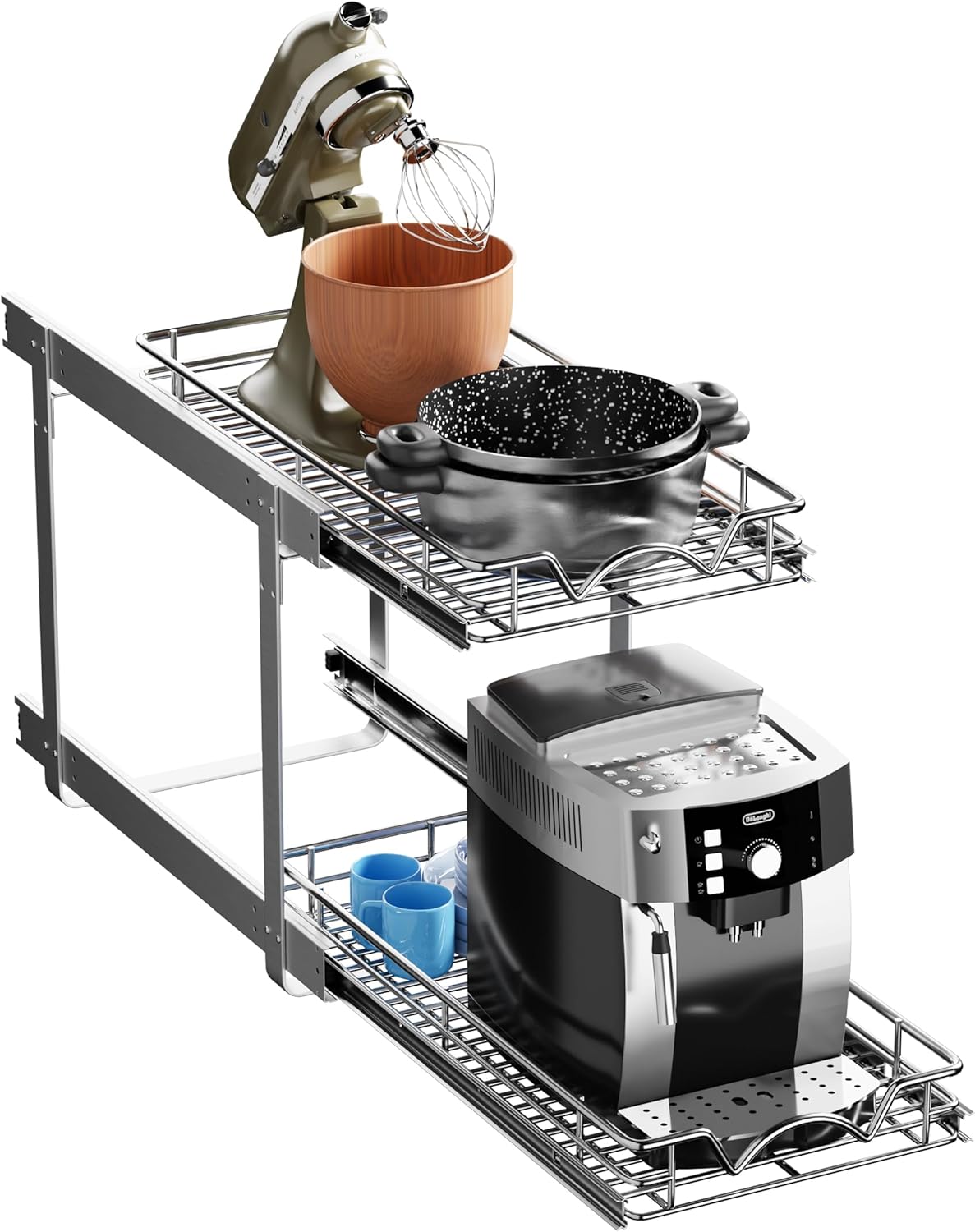• 2-TIER PULL OUT CABINET ORGANIZER: Maximize kitchen space with dual pull-out shelves that slide independently for full-extension access. Easily organize cookware, pantry items, or cleaning supplies in hard-to-reach cabinets.