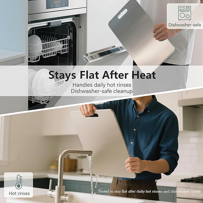 • 2 mm Thickness — Better Heat & Warp Resistance: Handles Hot Foods And Heavy Chopping Better Than Thin 1 mm Sheets; Stays Flat After Hot Rinses—resists Edge Lift And Bending; A Durable Pick Among Titanium Cutting Boards.