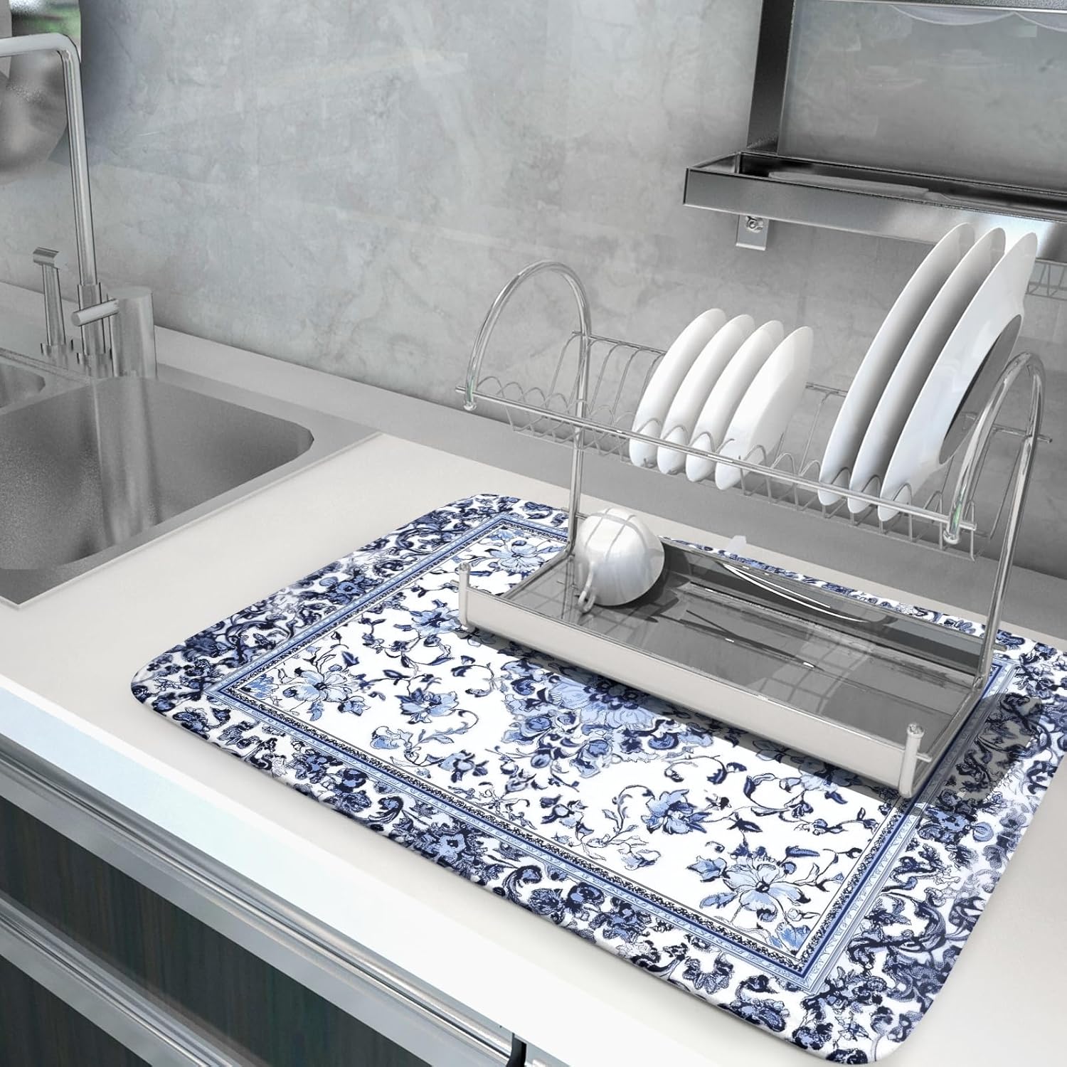 Boho Floral Dish Drying Mat 18x24 Inch Blue Leaves Kitchen Drying Pad Reversible Absorbent Dish Drainer Rack Mats Counter Tableware Decor